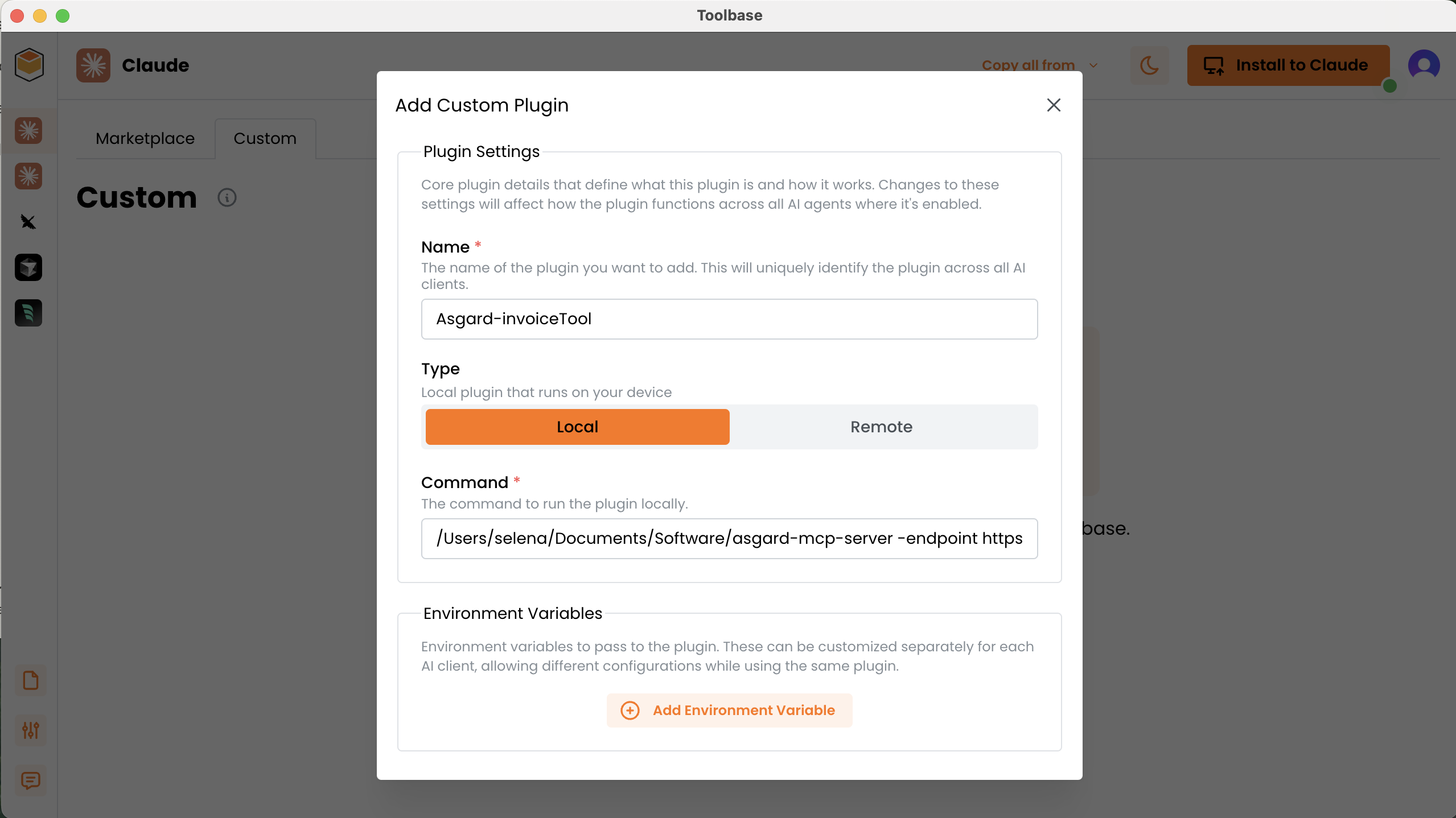 Local - Command: 輸入 Asgard MCP Server 的 Command 資訊,請記得將
