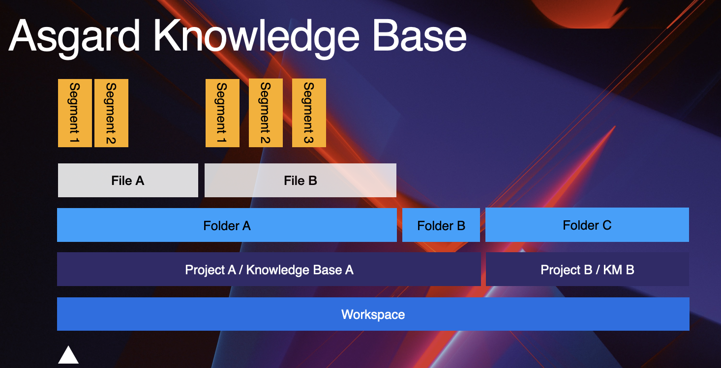 知識庫(Knowledge Base)可以集中管理所有相關知識,直覺的操作就如同管理資料夾一樣,用戶可以新增新的知識庫,並在底下新增該領域的相關文件以增強知識的擷取與訓練。Knowledge Base 的層級與 Project 相同,同一個 Project 底下會共用相同的知識庫,不同 Project 則不會互相影響。檔案匯入時,可以選擇自動分段(Segment)或是手動調整分段後儲存,分段的維度會影響知識處理的精準度,用戶可以嘗試不同分段調整最佳化輸出結果。匯入的知識經過 Asgard 系統處理後,能直接使用 Retrieve Knowledge 檢索知識庫的處理節點來加入工作流程。