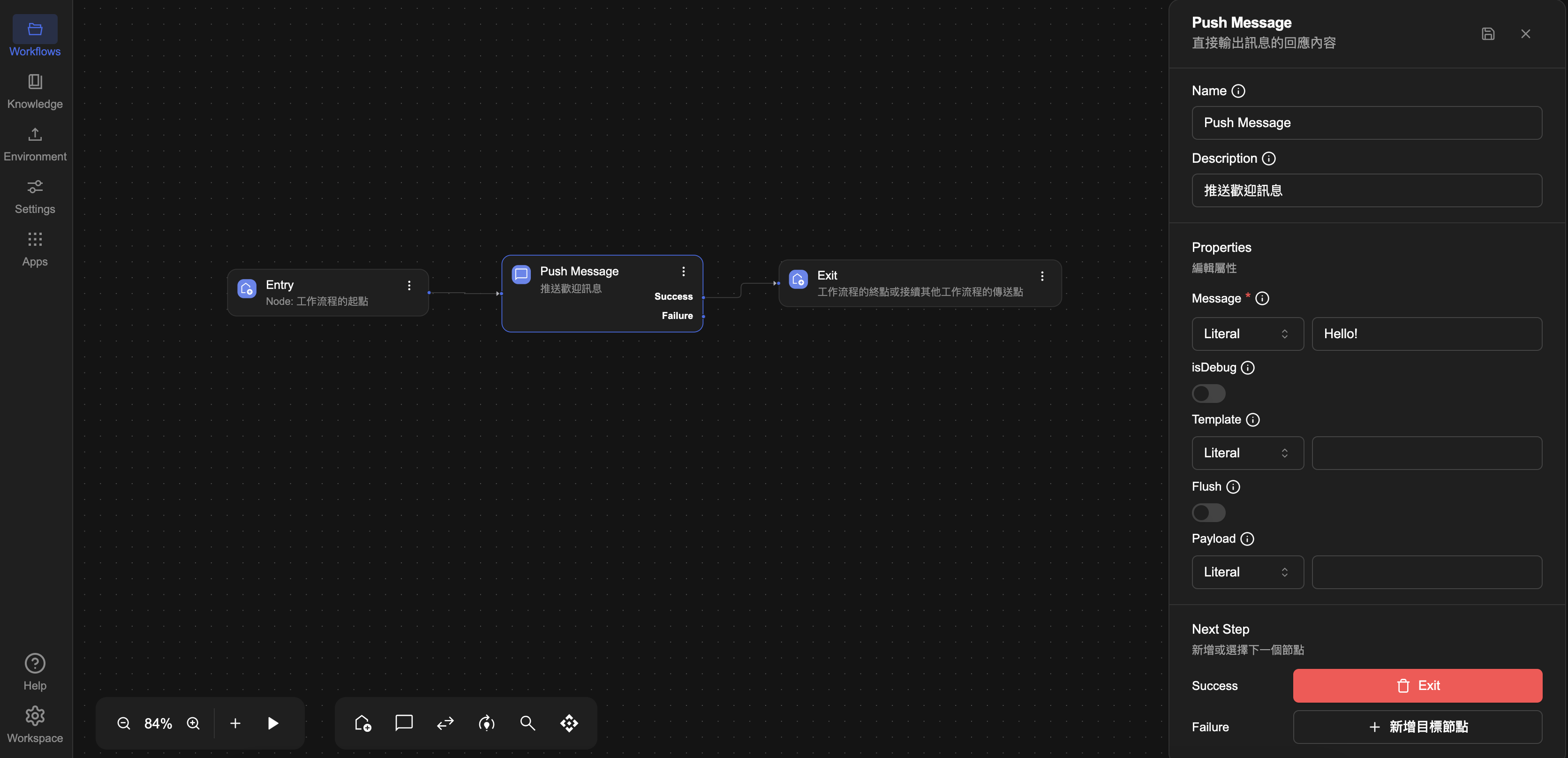 例如:上一則訊息內容、節點輸出值、使用者資訊等。透過 Expression,我們可以讓機器人的回應不再是靜態文字,而是根據實際輸入產生對應輸出,實現更具互動性的自動化流程。