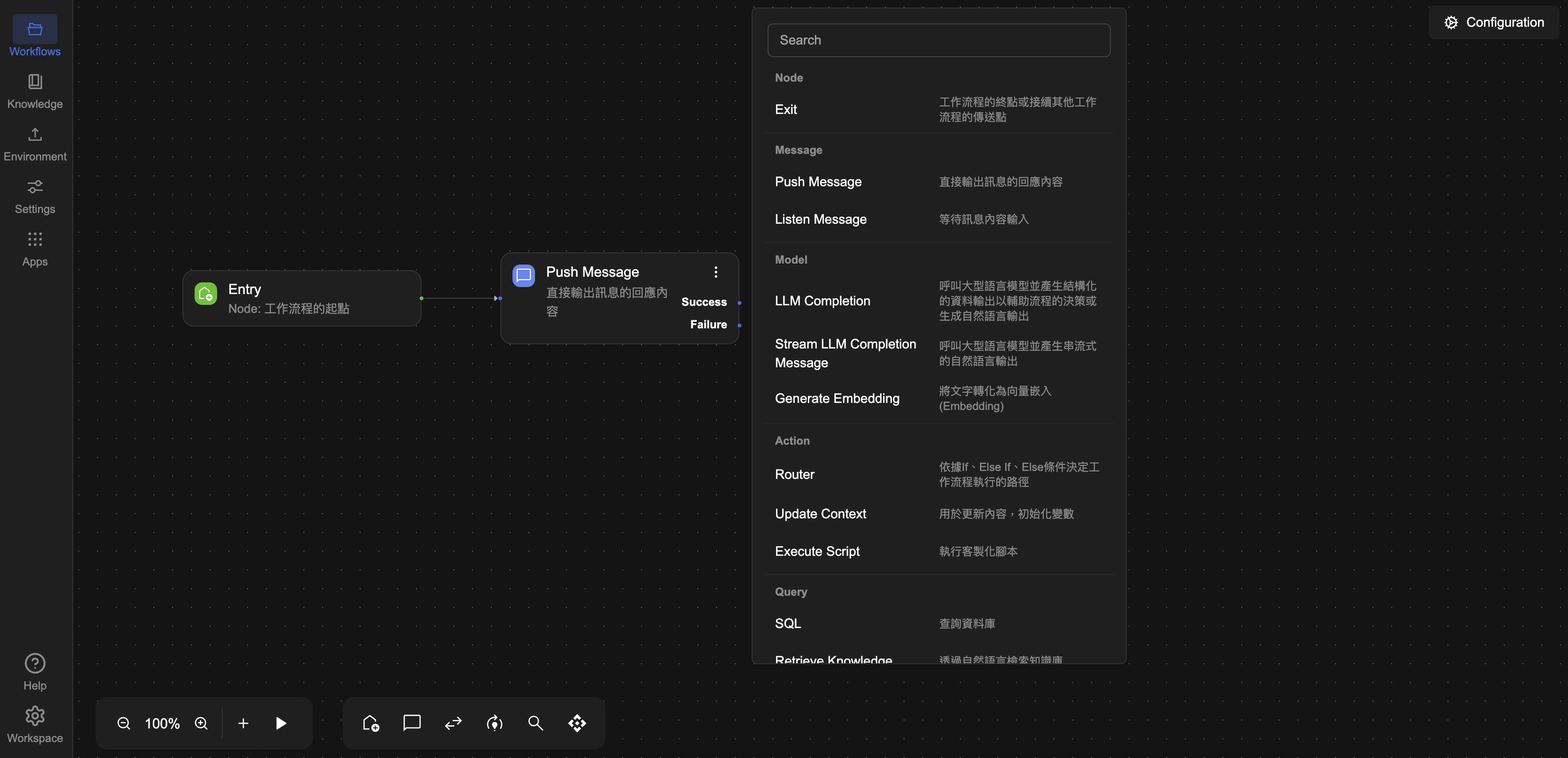 點選畫面左下方的 + Add Processor 按鈕,從節點清單中選擇 Listen Message。新增後,Listen Message 節點方塊將出現在工作流程編輯畫面中,串接於 Push Message 的 Success 之後。
