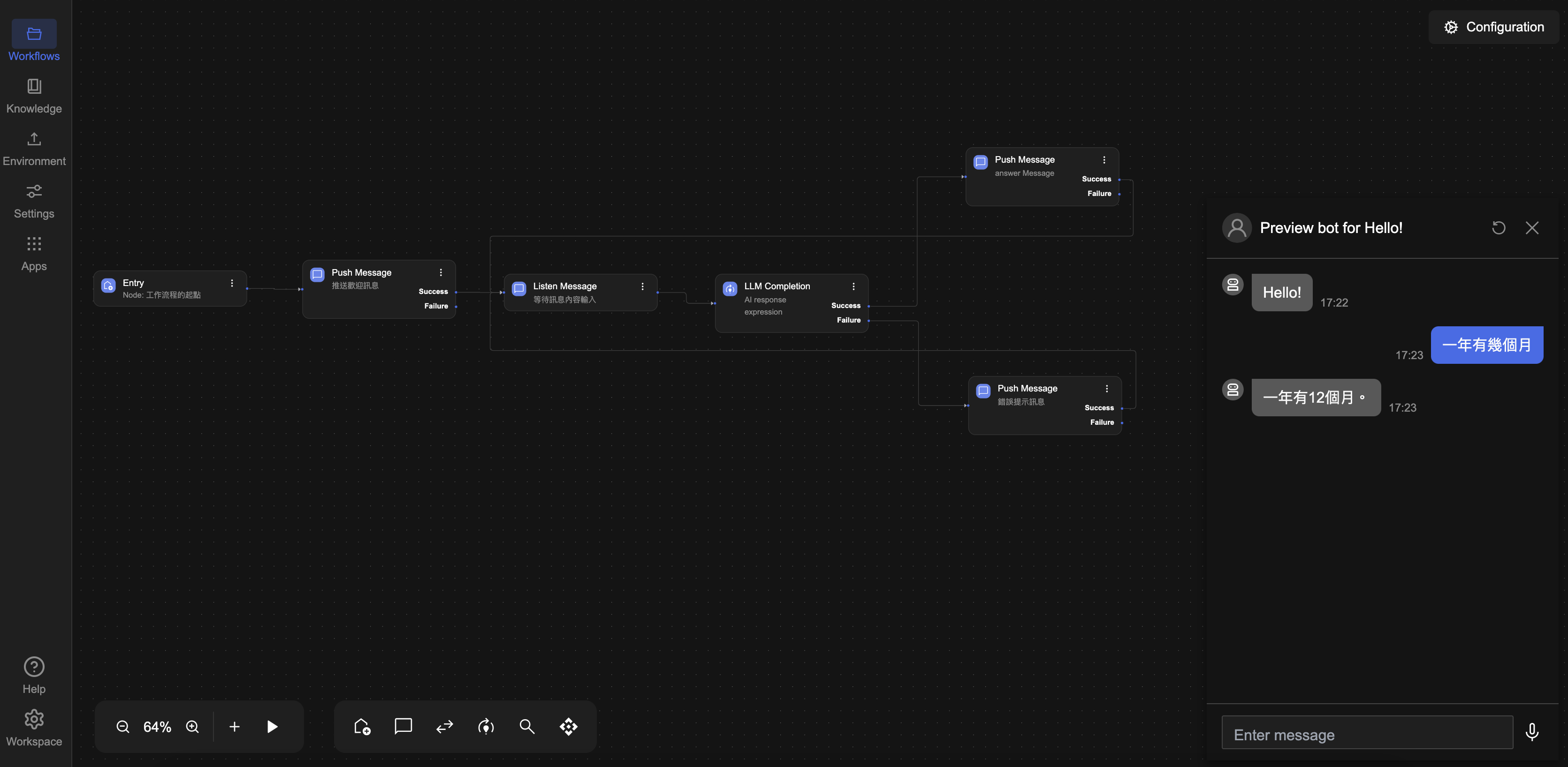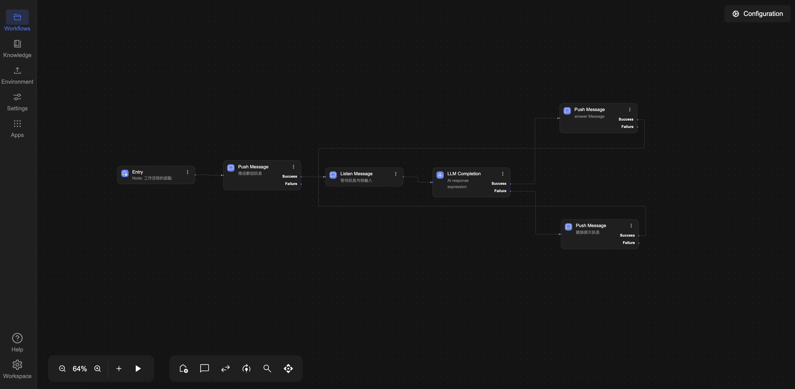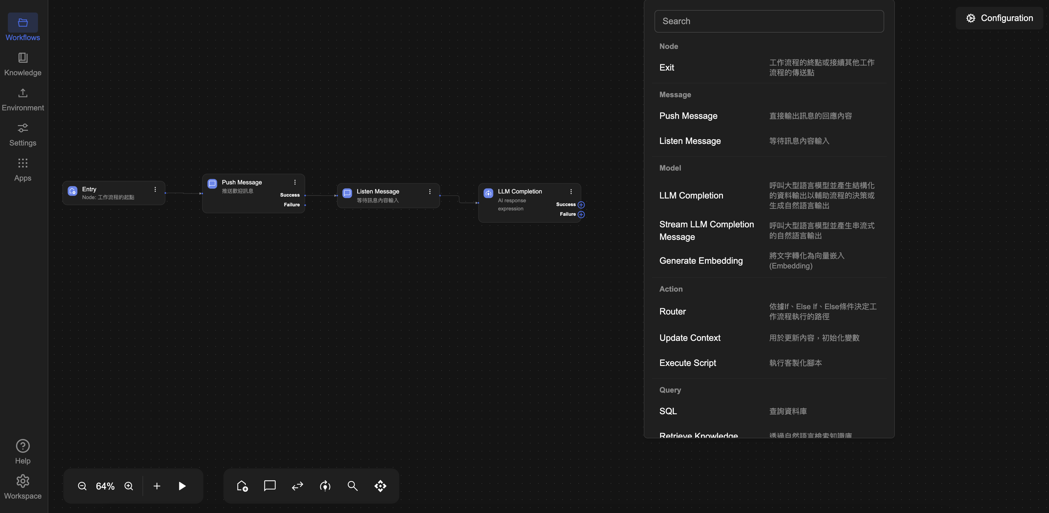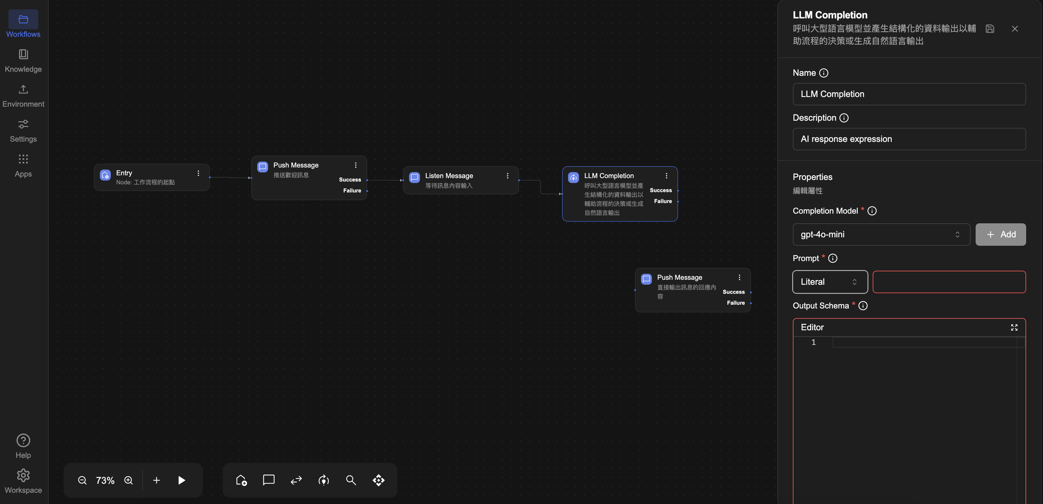 完成模型設定後,接下來點選左側選單中的 Workflow 分頁回到流程,設定 LLM Completion 節點的細節,讓 AI 能根據輸入產生回應。