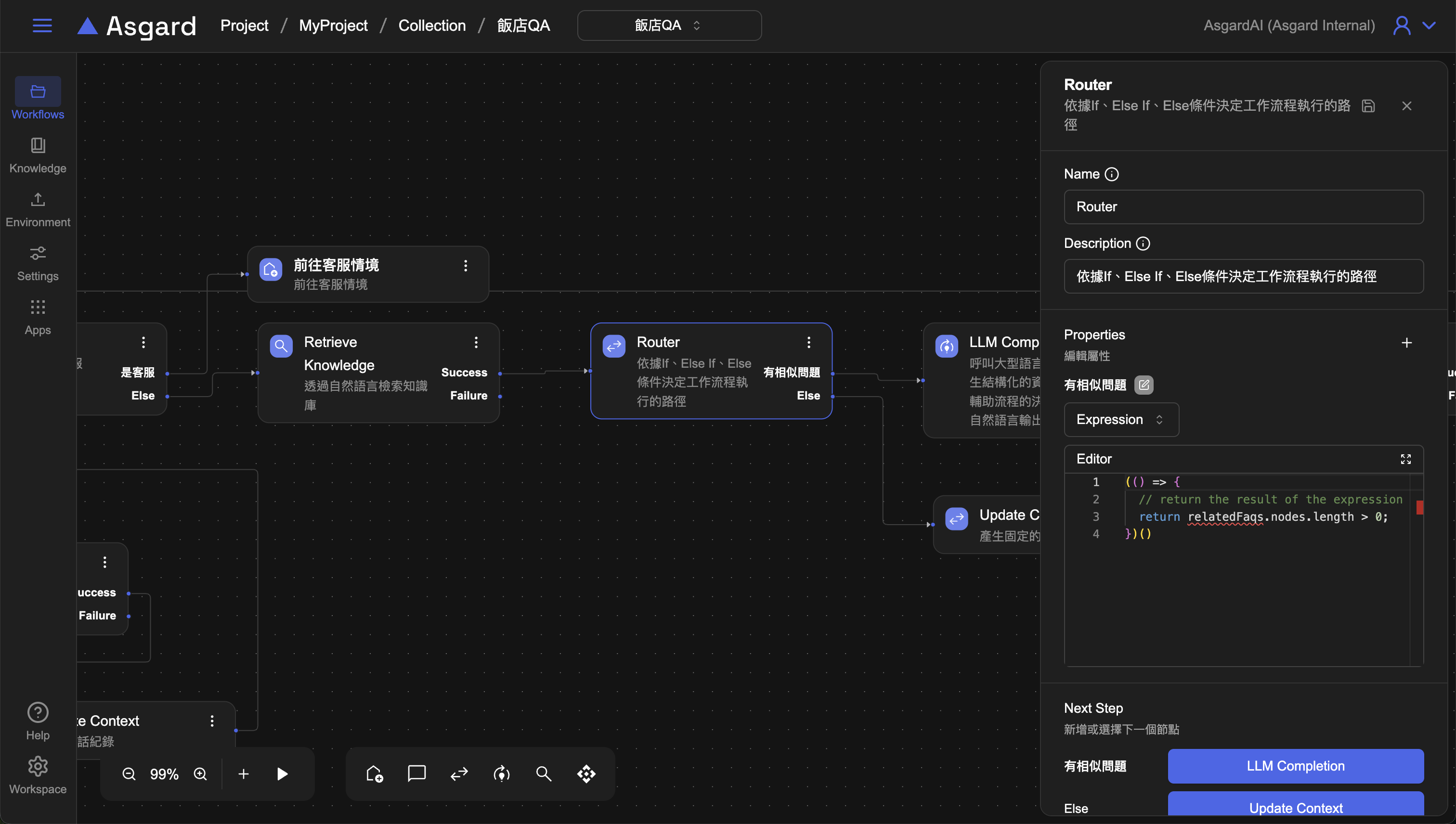 • 新增 Case 1 條件名稱可以自訂,此處改成「有相似問題」來幫助識別。選擇 Expression 並輸入以下範例: