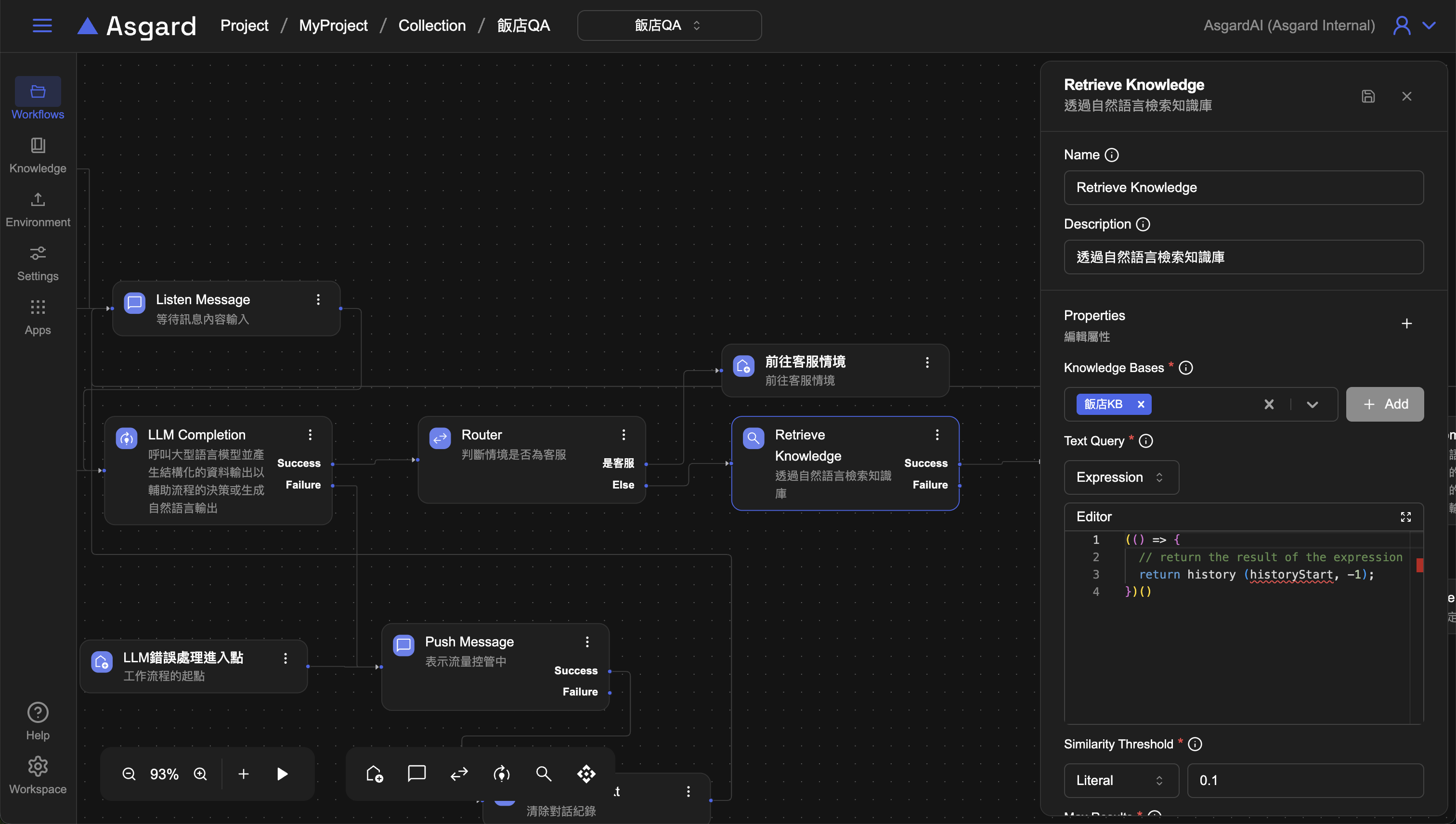 • Similarity Threshold 填入 0~1 之間的數字,1 代表最相似,以此遞減。範例使用 0.1 這個數值,因為用戶的問題相關性可能不高,因此選用 0.1 這個數值。