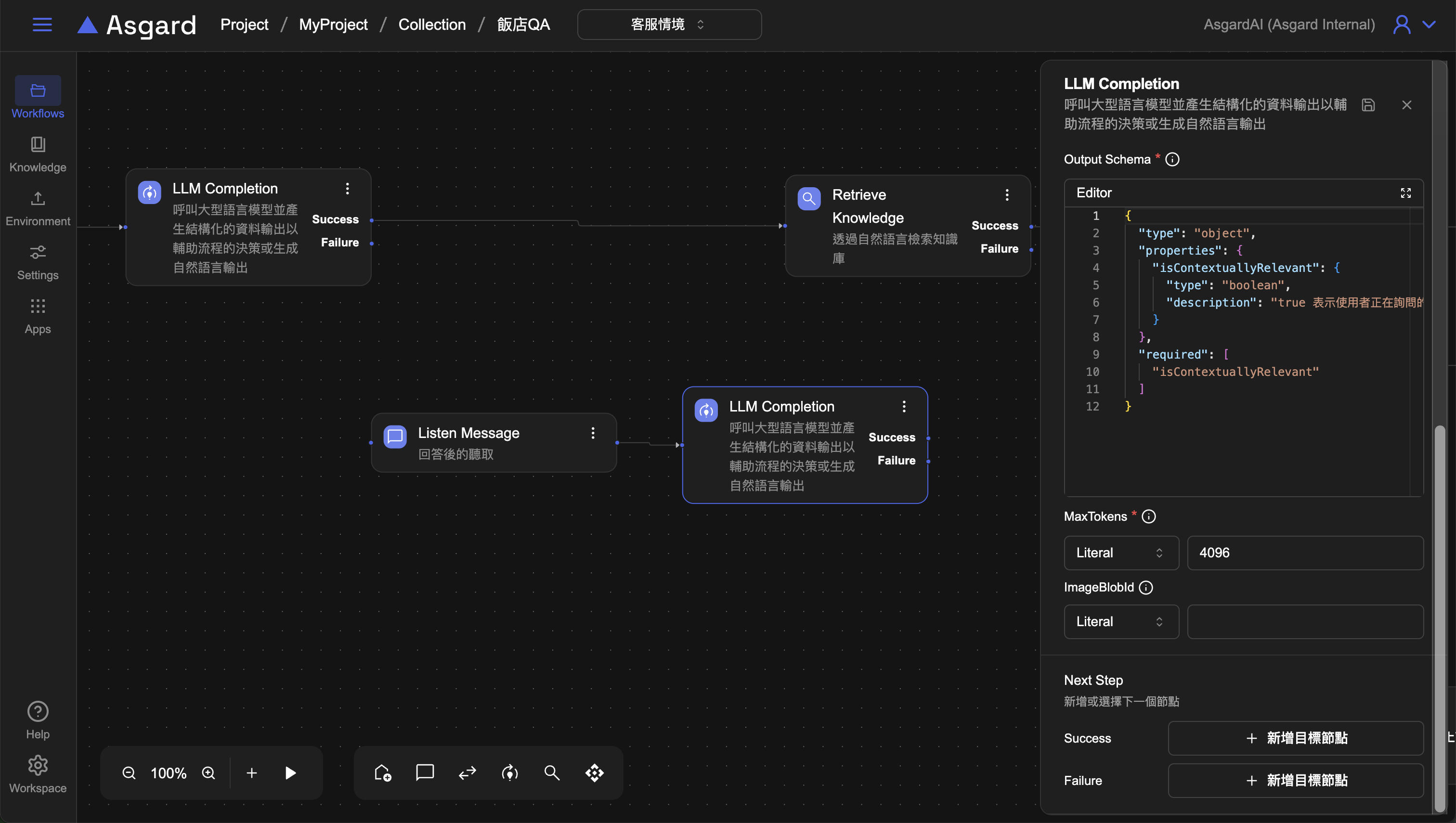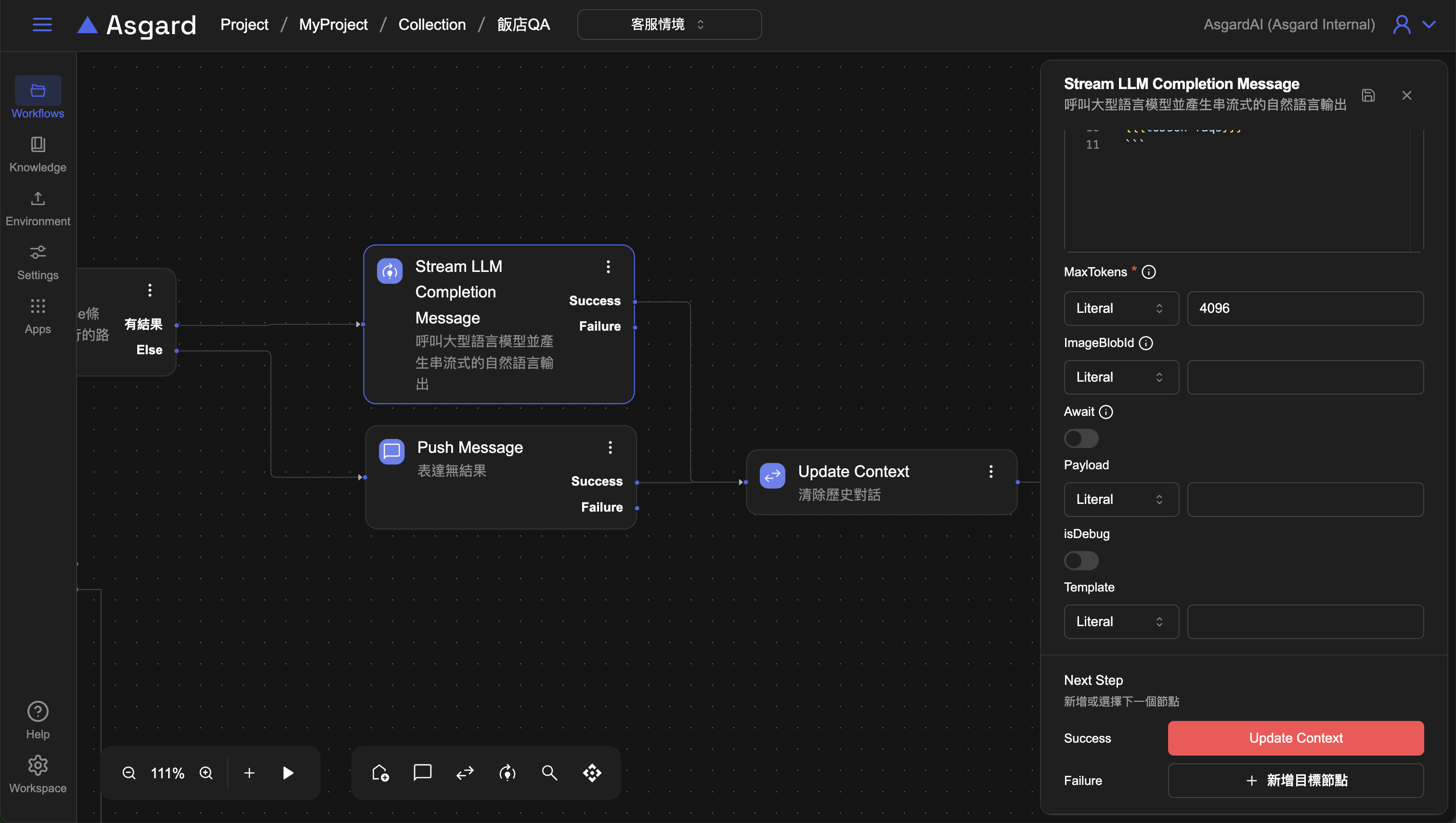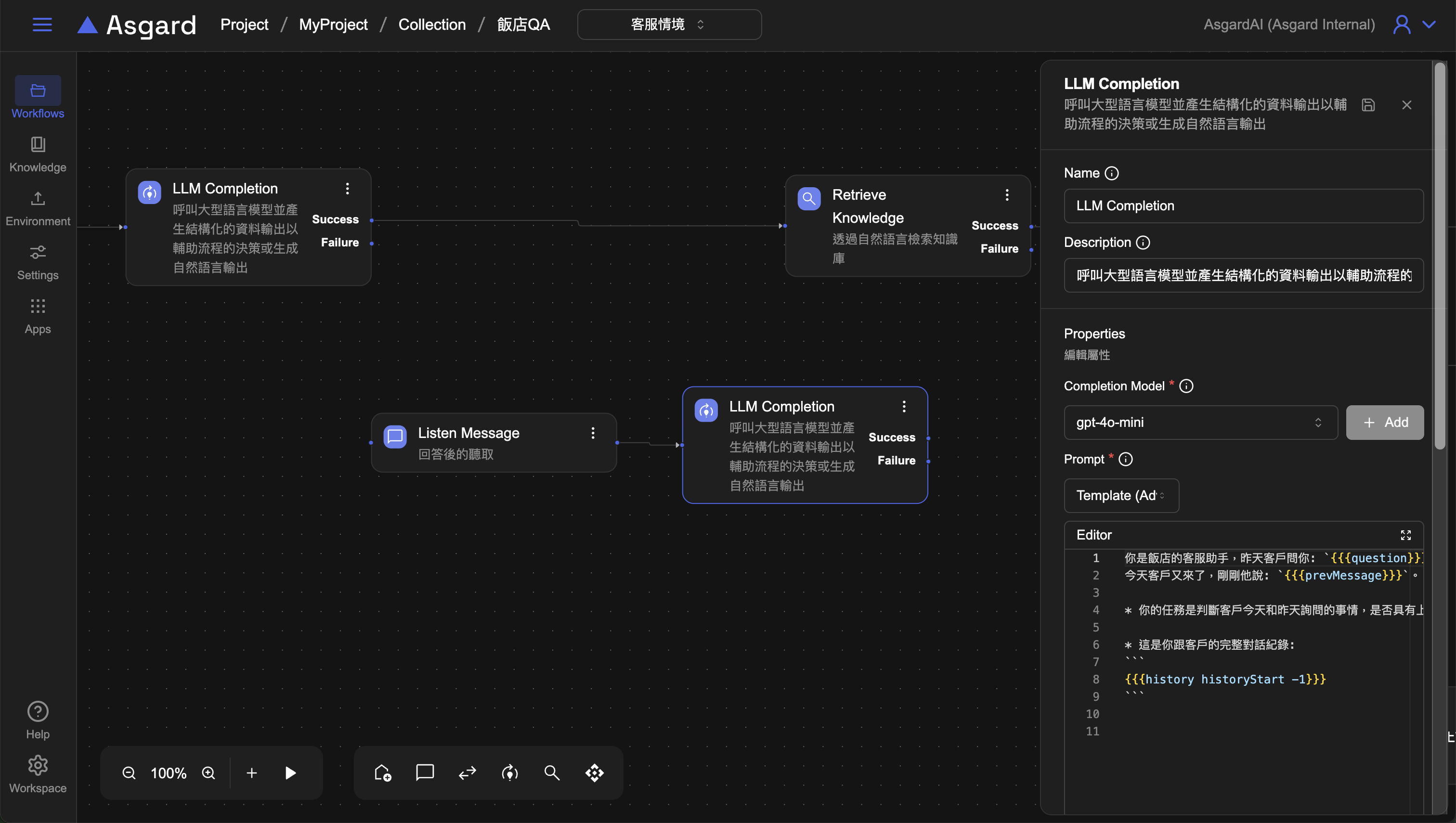 history為 Asgard 內建函數,historyStart 為步驟 2 時在 Update Context 裡所新增的變數,-1 是指算到上一個對話為止,因此這裡是在告訴 LLM 用戶的歷史對話紀錄是從 historyStart 到上一個對話,也就是上一步的 Listen Message 用戶輸入的問題。prevMessage也是 Asgard 內建函數,即為前一個對話。