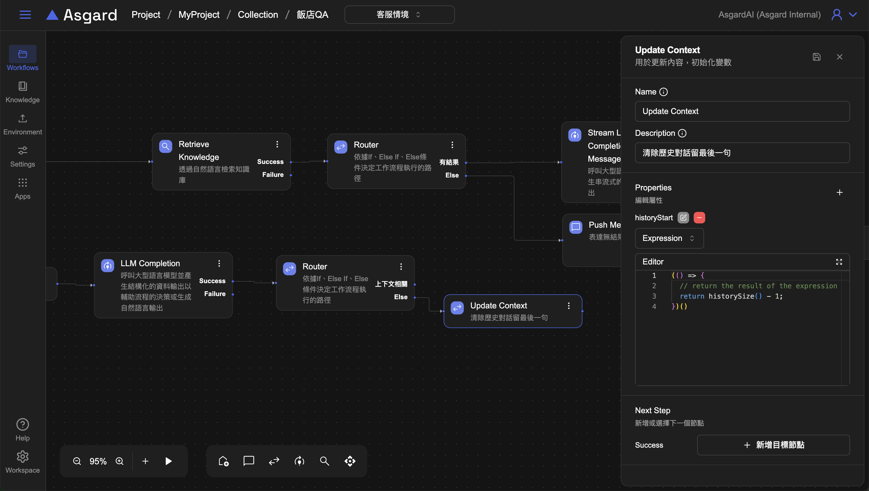 historySize為 Asgard 內建函數,historyStart 為先前在 Update Context 裡所新增的變數,historySize 是指訊息的總量,每一則訊息都會記算一筆,算到上一個對話為止,因此這裡是將 historyStart 更新為 historySize -1,即為最後一則對話。