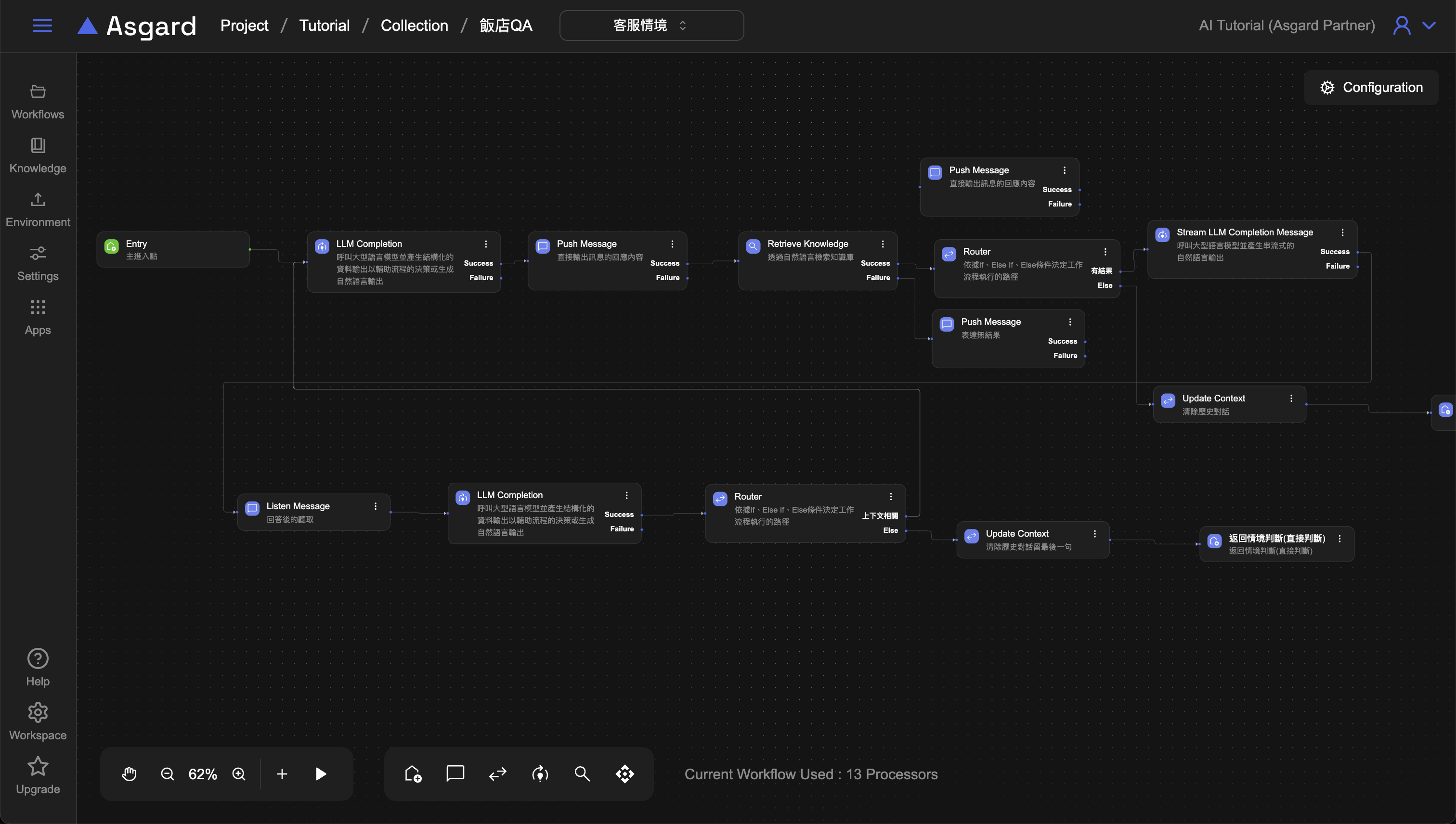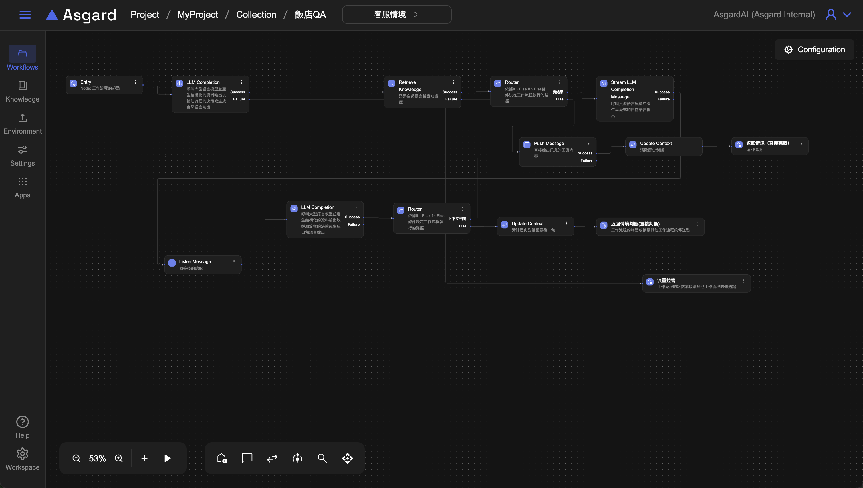 將 Exit「返回情境判斷(直接判斷)」 與 Entry 「直接判斷情境進入點」連接便完成了 AI 找不到回答的流程處理,並能將用戶導向到先前設計的 LLM Completion 去直接判斷是否為客服情境。