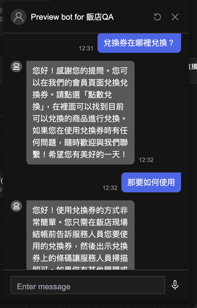 至此我們將客服 AI 做了情境脫離,客服 AI 能判斷是否為客服情境並搜尋知識庫內的知識做出自然語言的回應,假如用戶後續文題為上下文相關的話,客服 AI 能夠脫離情境,接續該問題回答。假如上下文不相關的話,客服 AI 能夠回到直接判斷的進入點,並判斷最後一則訊息是否為客服情境範圍,若不是客服情境則會出現非客服。點擊 Preview 來預覽並測試以下情境: