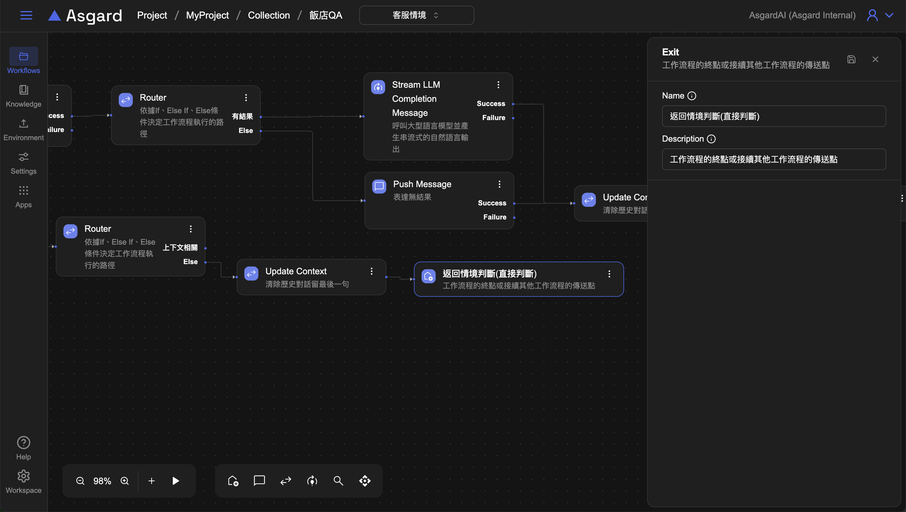 在 Update Context 後新增Exit並修改名稱與描述為「返回情境判斷(直接判斷)」。此時的 Exit 會作為接續其他工作流程的傳送點。
