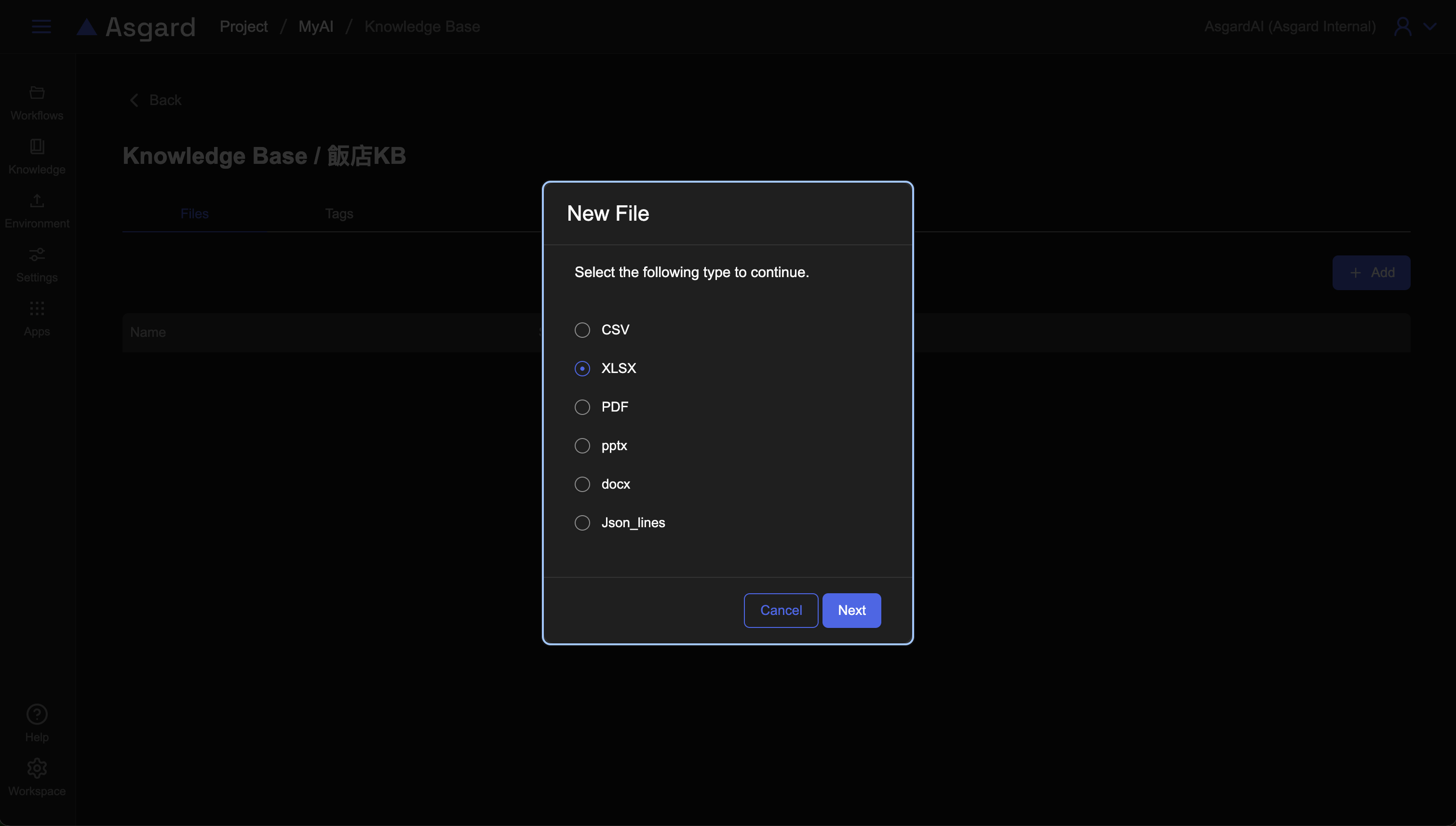 - Knowledge Base 選擇第一步時建立並匯入好檔案的知識庫,或是可以點擊「Add」以新增知識庫設定,注意知識庫內記得匯入檔案。