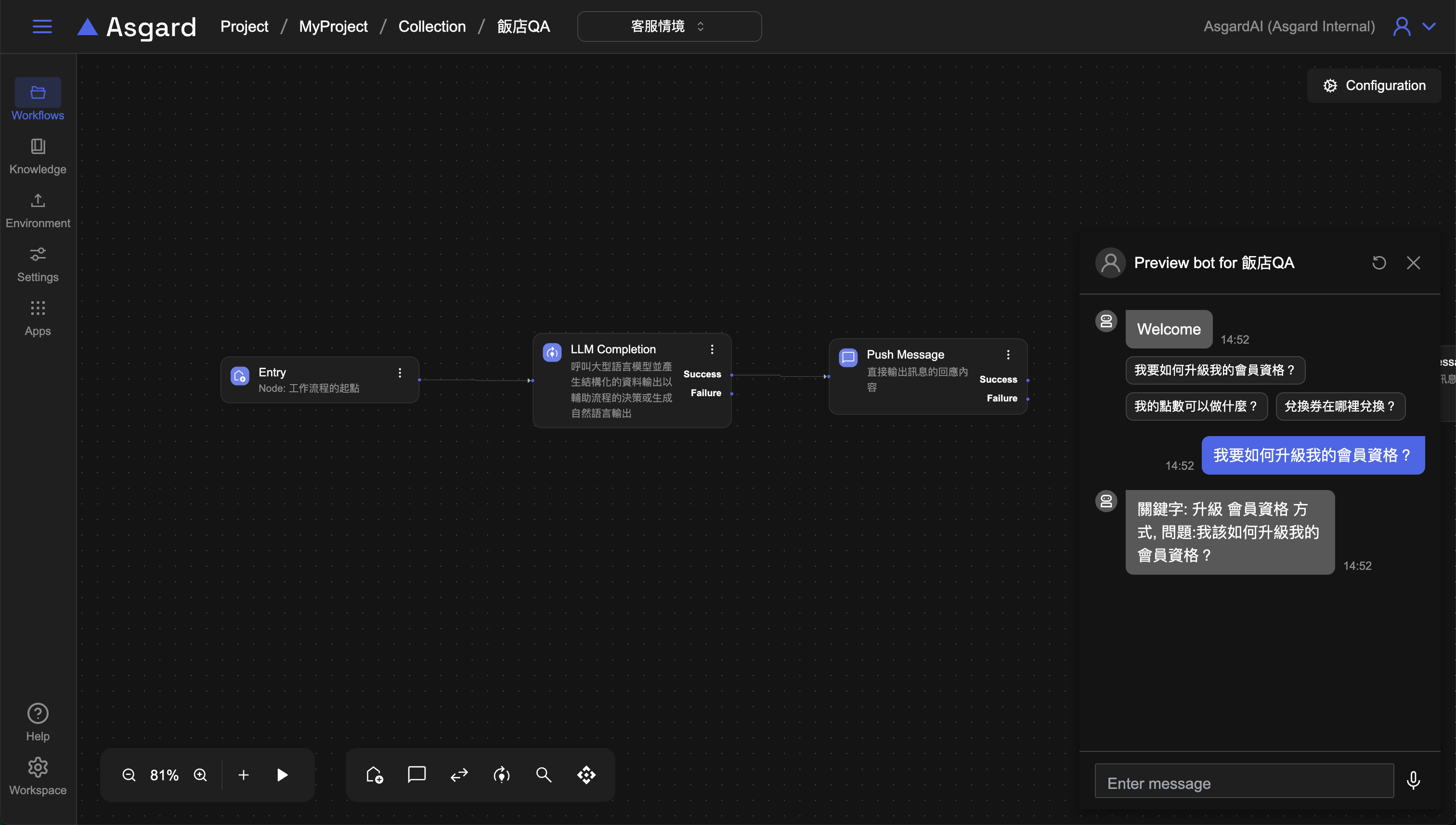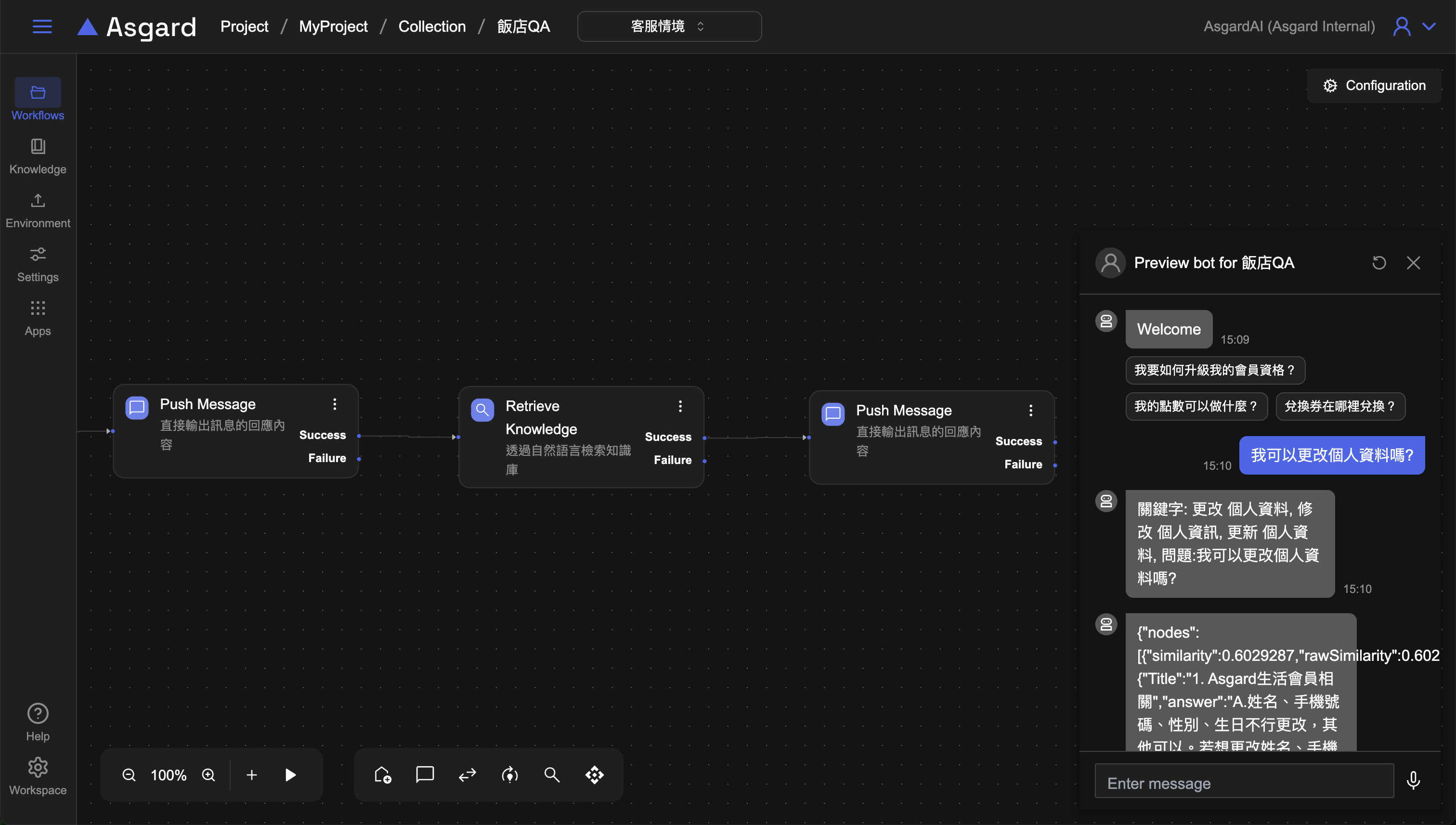 點擊 Preview 來預覽工作流程是否有檢索到對應的問題回答。當用戶問了與知識庫相關的問題時,AI 應該要能精準搜尋到對應的回答。