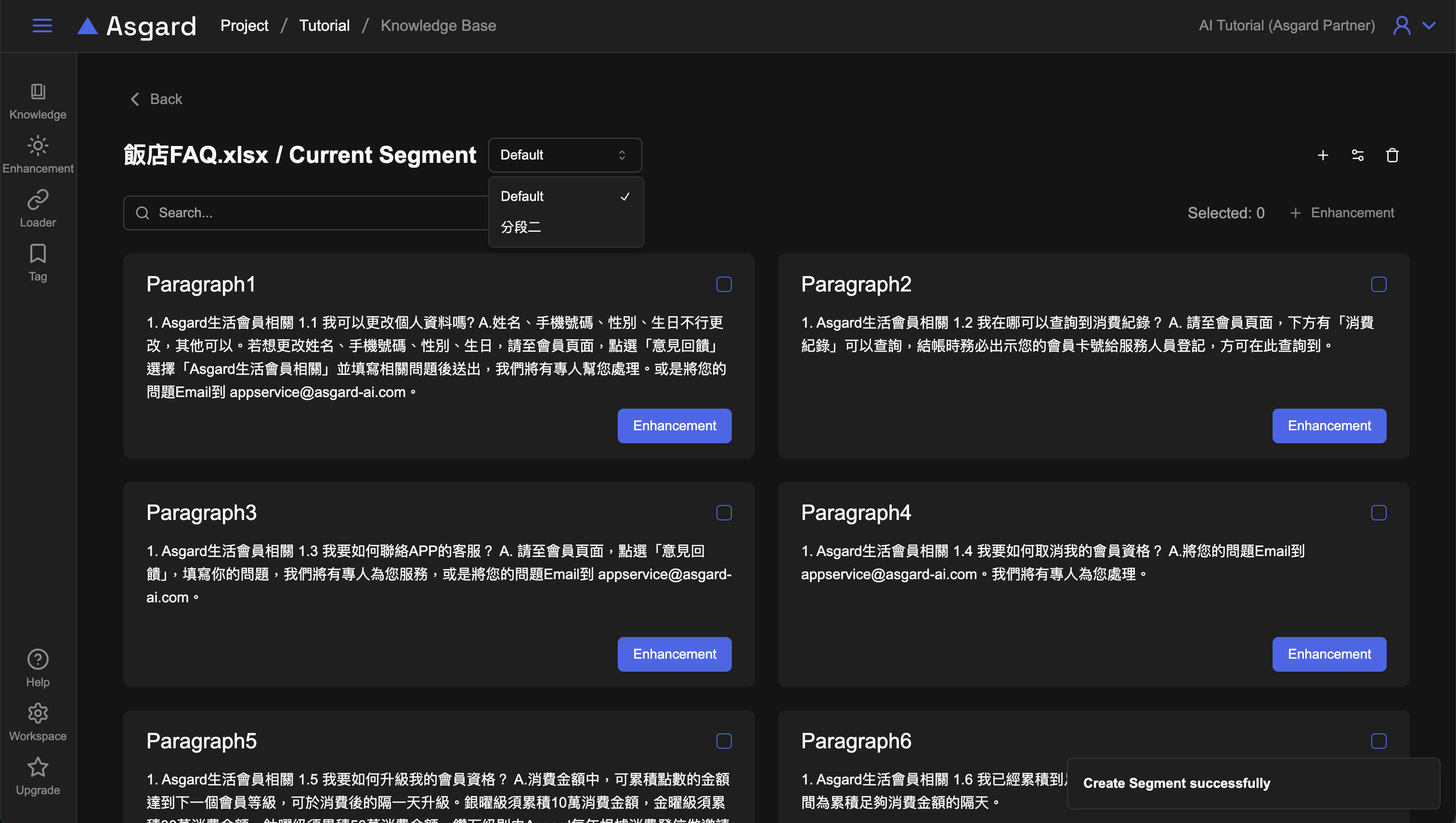 - Answer 答案:選擇的該分段知識如為問題,可以去新增 enhancement 作為該問題的其他不同的回答方式。