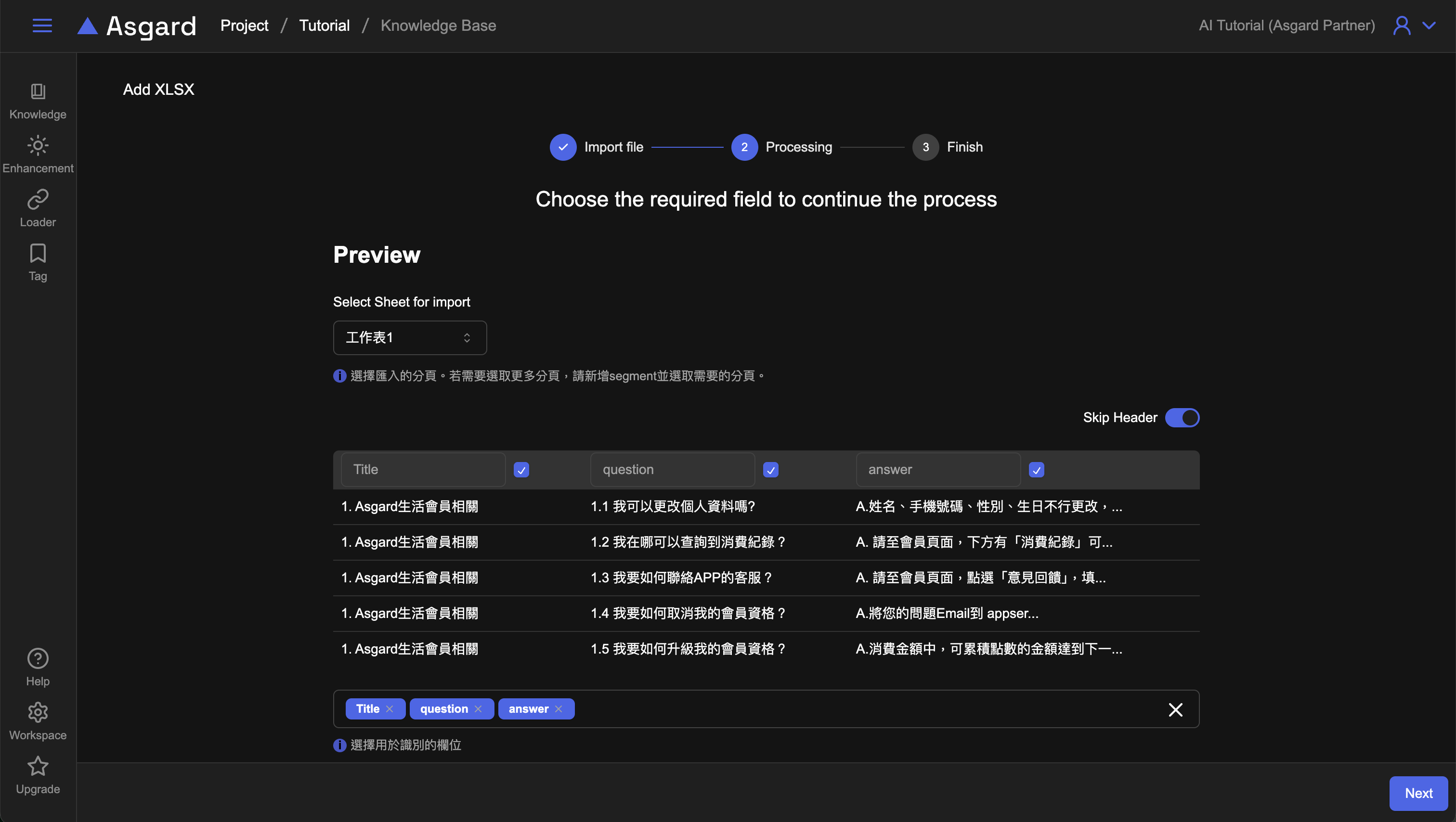 - 選擇用於識別的欄位。當文件沒有 primary key 時,建議此處全選,範例檔案中為 title+question+answer。識別的欄位會作為後續 Enhancement 的計算。