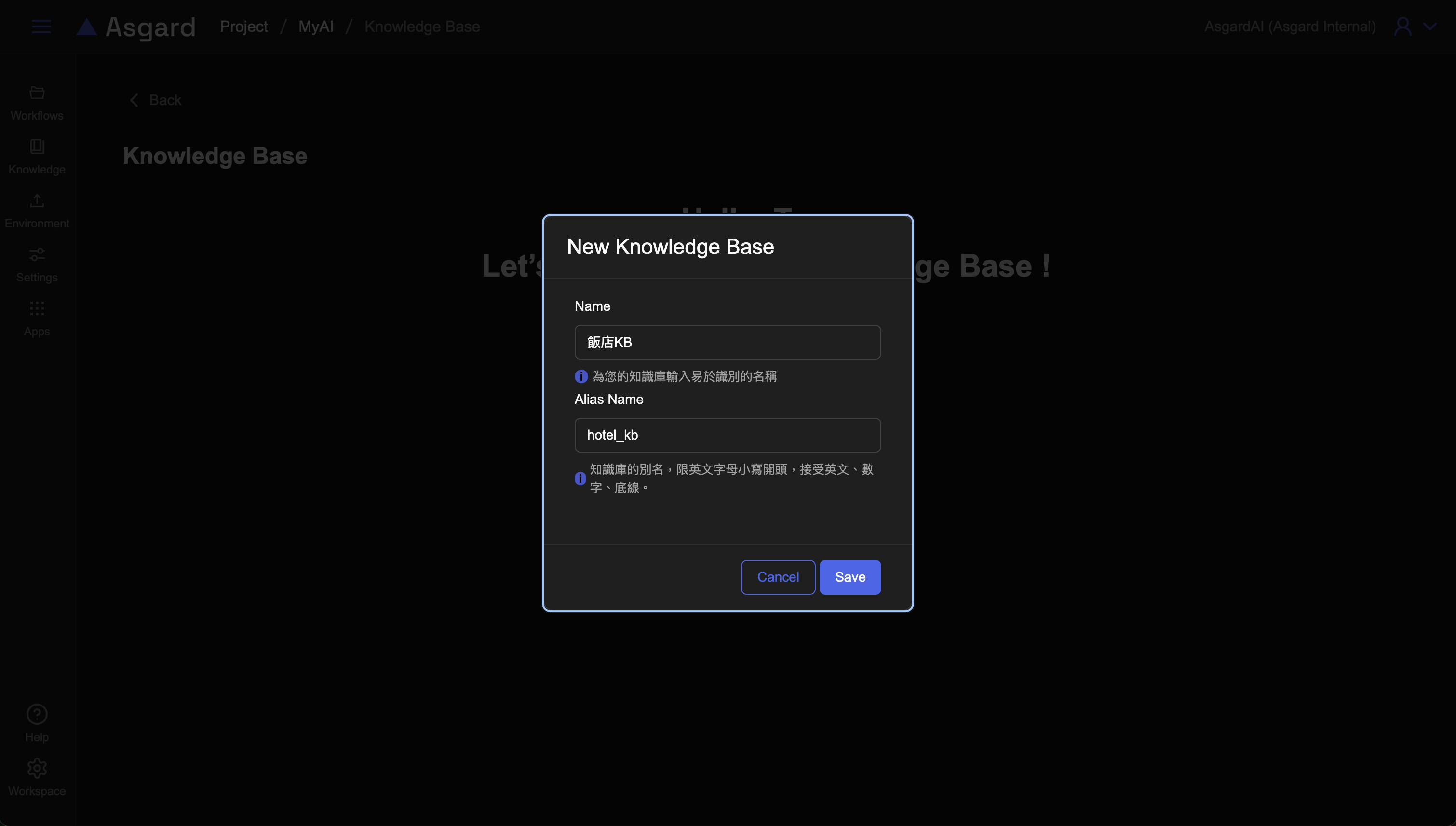 輸入名稱與知識庫別名,別名限英文字母小寫開頭,接受英文、數字、底線的組合。此處我們輸入飯店 KB 與 hotel_kb 易於識別。