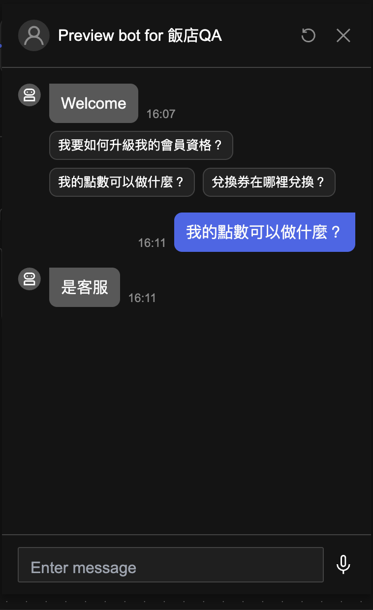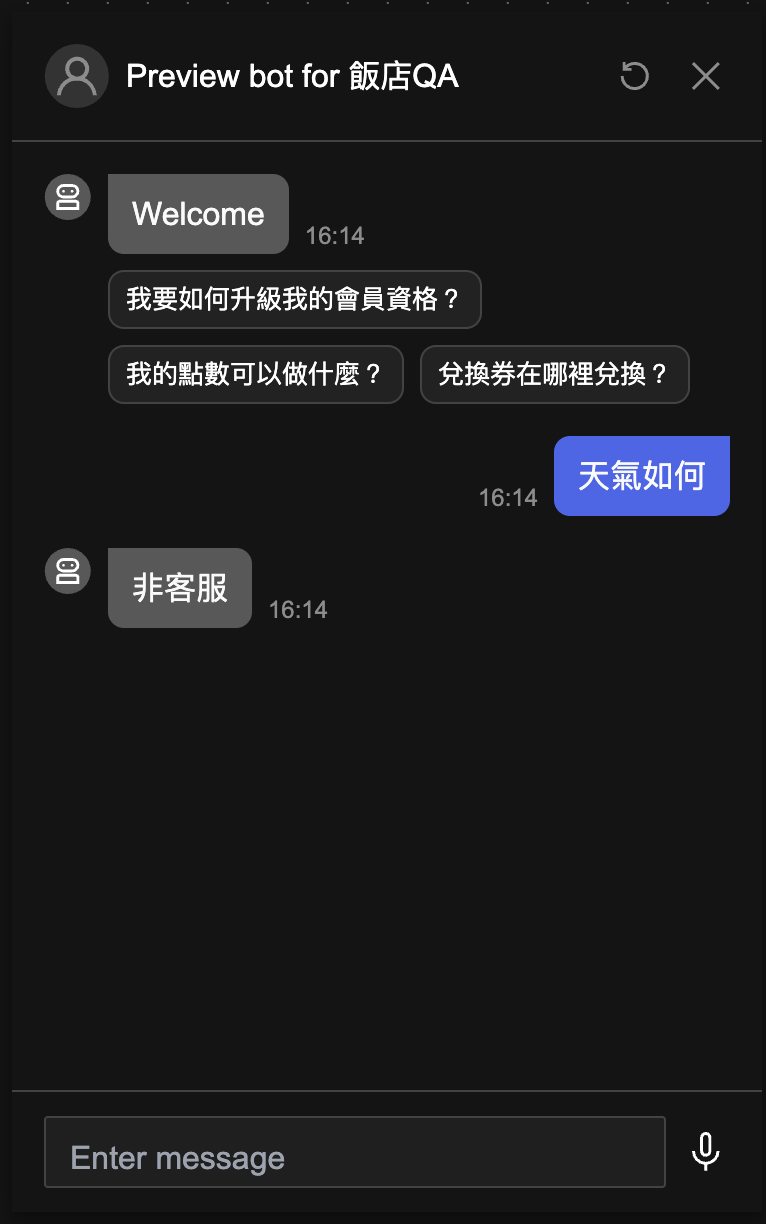 點擊 Preview 來預覽剛剛編排好的工作流程,若執行成功應可順利看到以下飯店 QA 的 Bot。接著就可以測試 AI 是否能正常判斷用戶的問題為客服問題或非客服問題。
