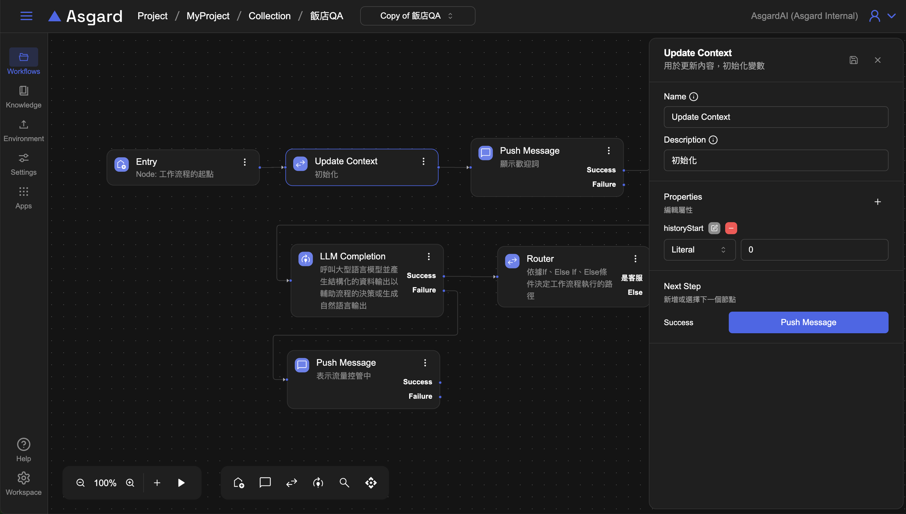 history為 Asgard 內建函數,historyStart 為步驟 2 時在 Update Context 裡所新增的變數,-1 是指算到上一個對話為止,因此這裡是在告訴 LLM 用戶的歷史對話紀錄是從 historyStart 到上一個對話,也就是步驟 4 的 Listen Message 用戶輸入的問題。