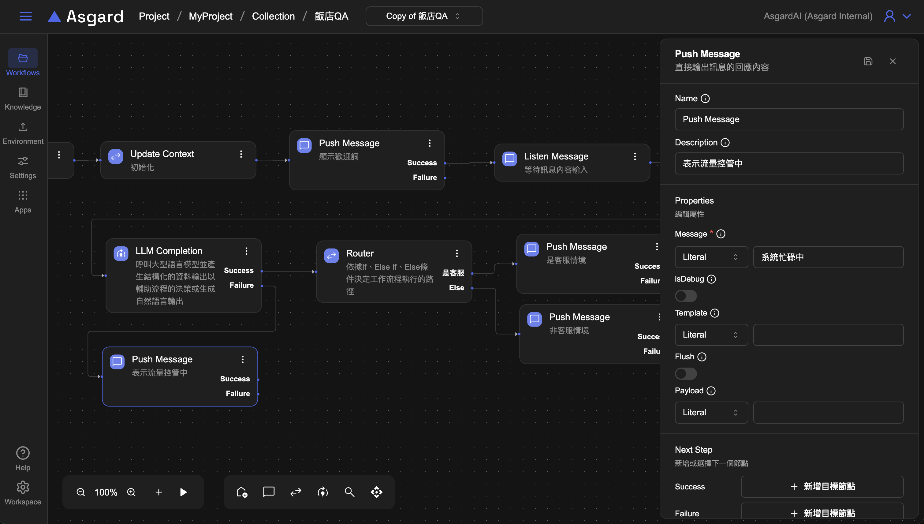 Push Message ,LLM 調用外部 AI model,通常會有調用成功與失敗兩種情況,當 Success 成立,就接到下一步的 Router 處理,當 Fail 時,可以加上 Push Message 來提示用戶。
