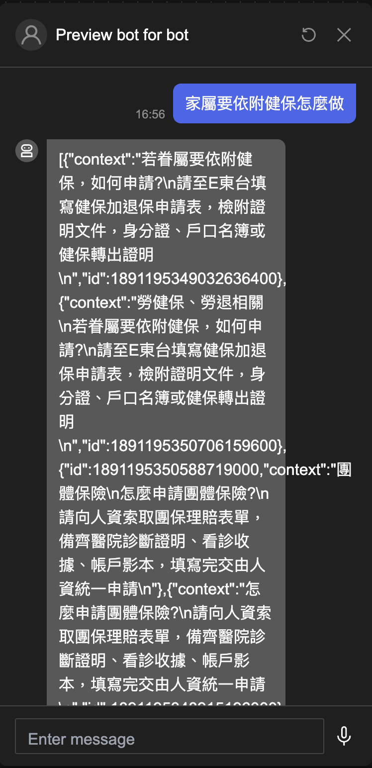 點擊 Preview 預覽。直接在預覽視窗輸入問題後送出,AI 會將該問題轉成向量並查詢資料庫後,將相似度高的資料印出。