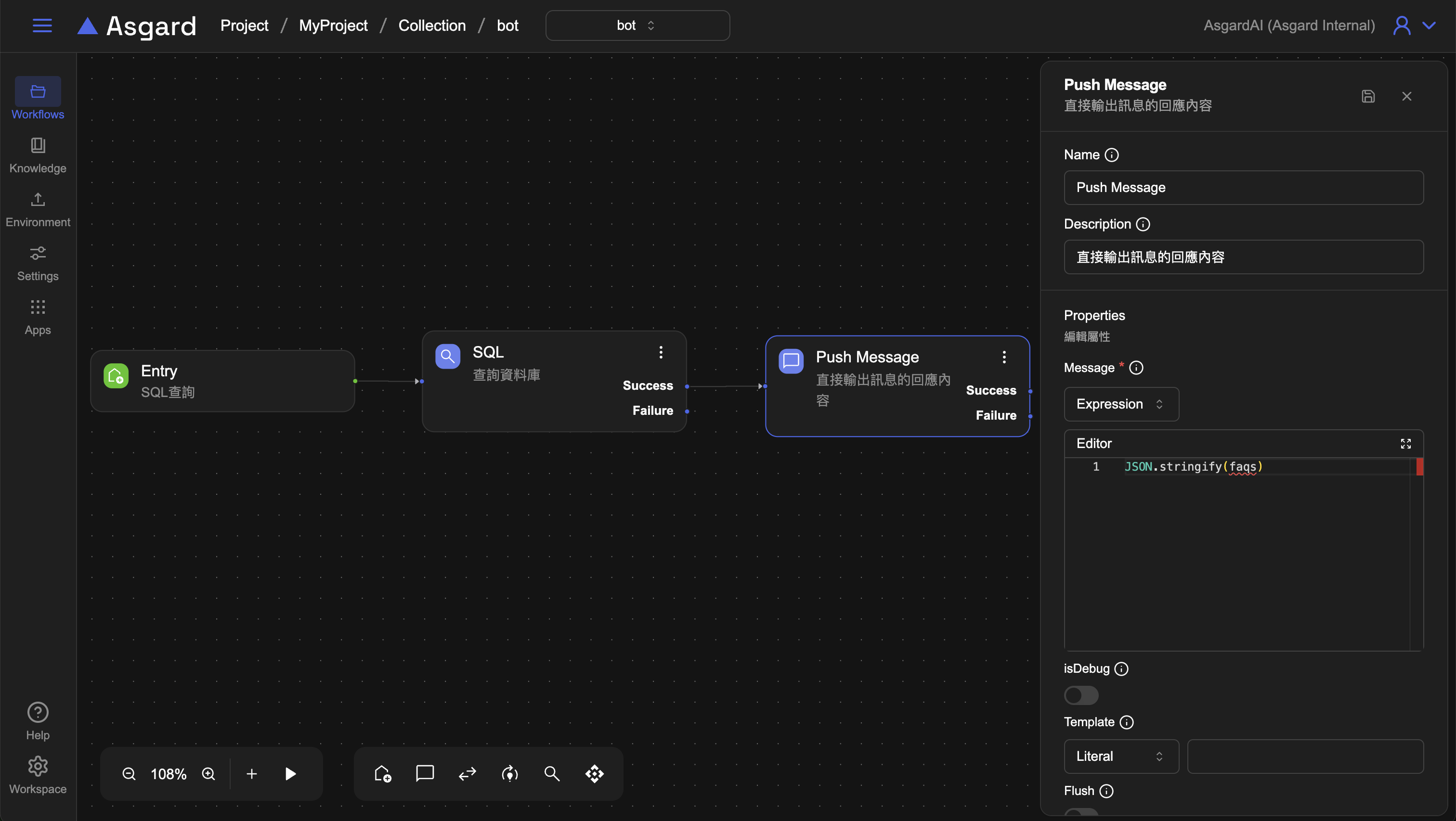 新增一個 Push Message 節點來印出查詢結果內容。