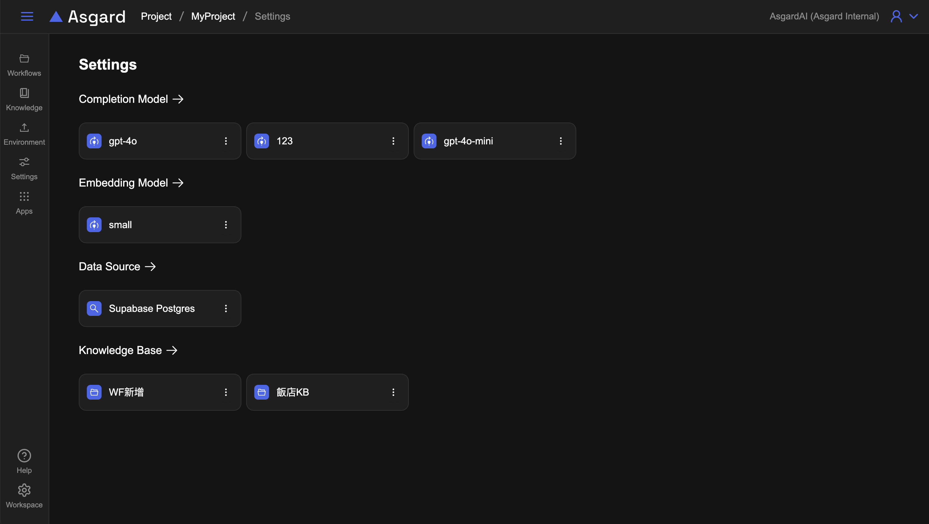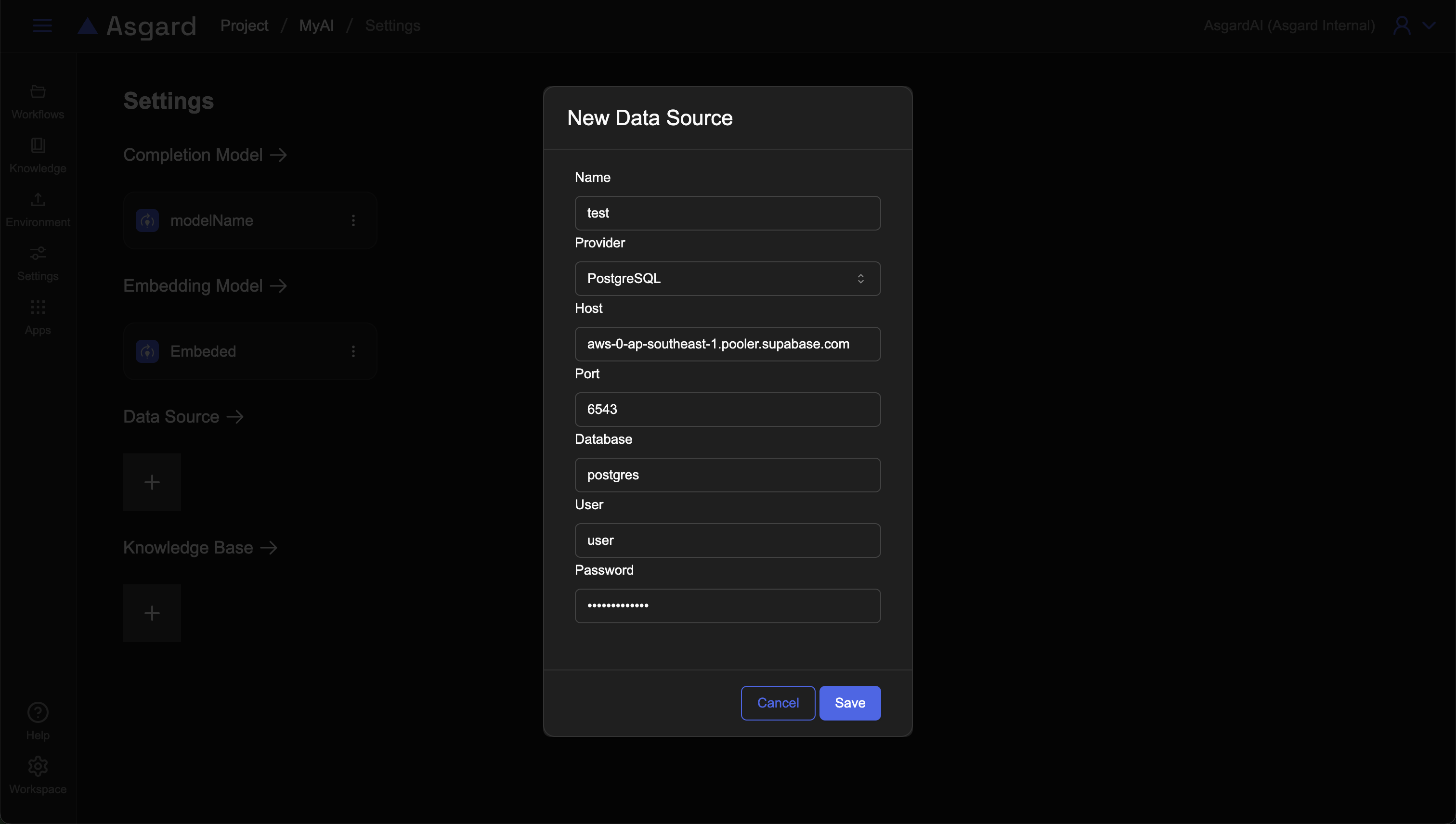在 Project 內,可以點擊左側 Settings 並選擇新增資料來源,填入相關資訊後,即可在 Workflow 內使用下拉式選單選取資料來源。若沒有事先設定,則在 Workflow 新增 data source 時,會跳出新增資料來源的彈窗,設定後即可使用。