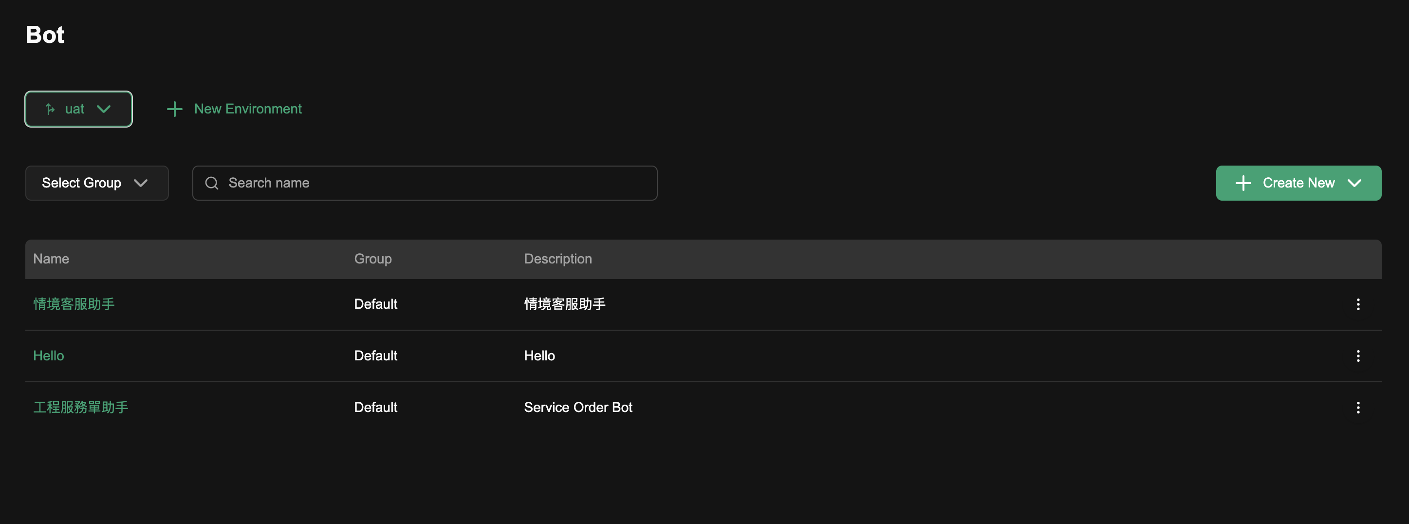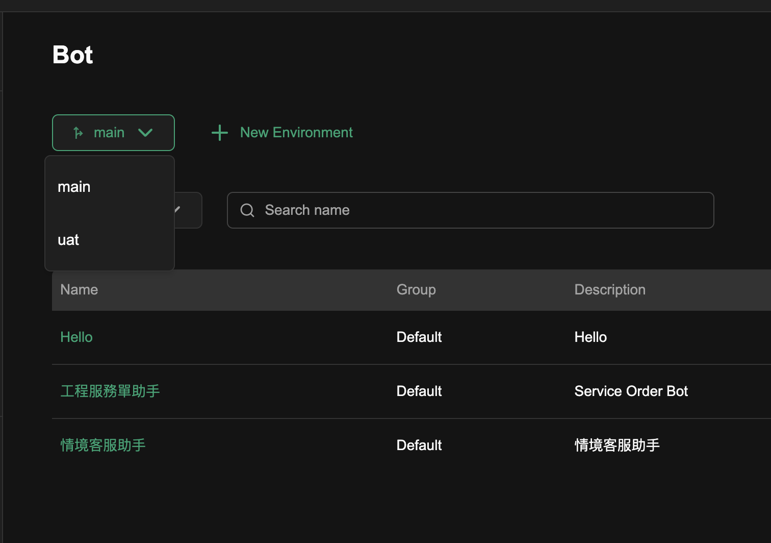 新建的 uat 環境會從 main 複製一份相同的 Collections,包含 Bot 與 Function 類型