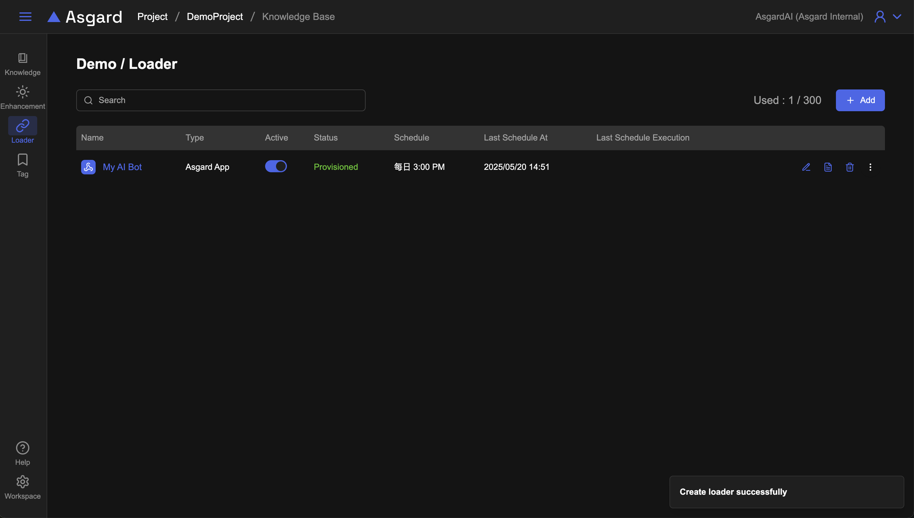 Asgard 提供了自動化的擷取知識載入(Loader)的功能,能夠讓您一次設定好資料的來源與排程,後續皆交由系統自動化幫您更載入即可,省時有效率。