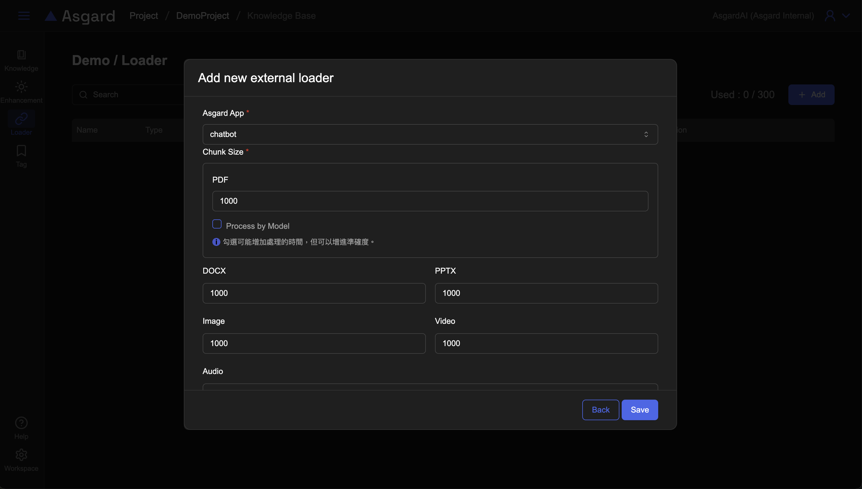 Asgard App Loader 可以選擇已在 App 功能裡設定好的 App 整合應用,選擇 App 後請設定對應檔案預使用的分段大小(Chunk Size)設定,也可以直接使用預設的值執行。