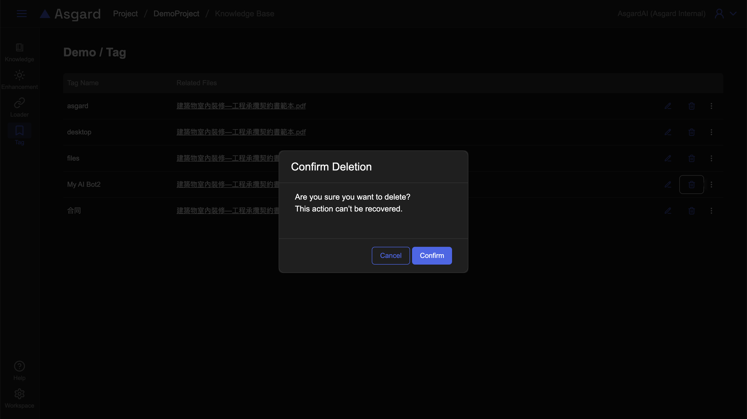在知識庫內的左側功能列,點擊 Tag 可以檢視當前知識庫(例如 Demo)的所有標籤。您可以編輯或是刪除該標籤。