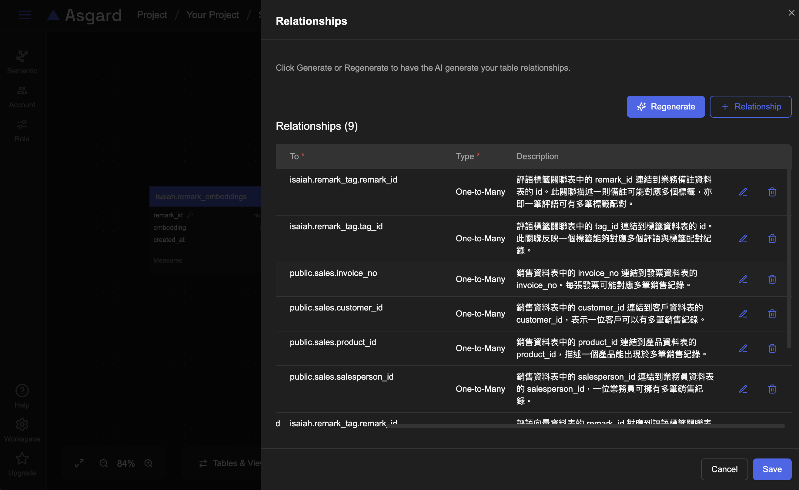 AI 會產生如下的 relation list ,每一行代表一個 relation,詳細定義如下,如果還要新增更多 Relation 可以點擊下方的新增按鈕。