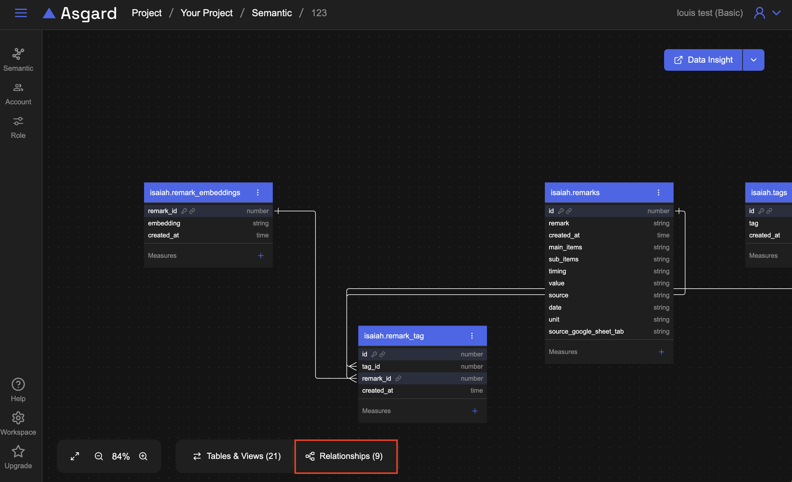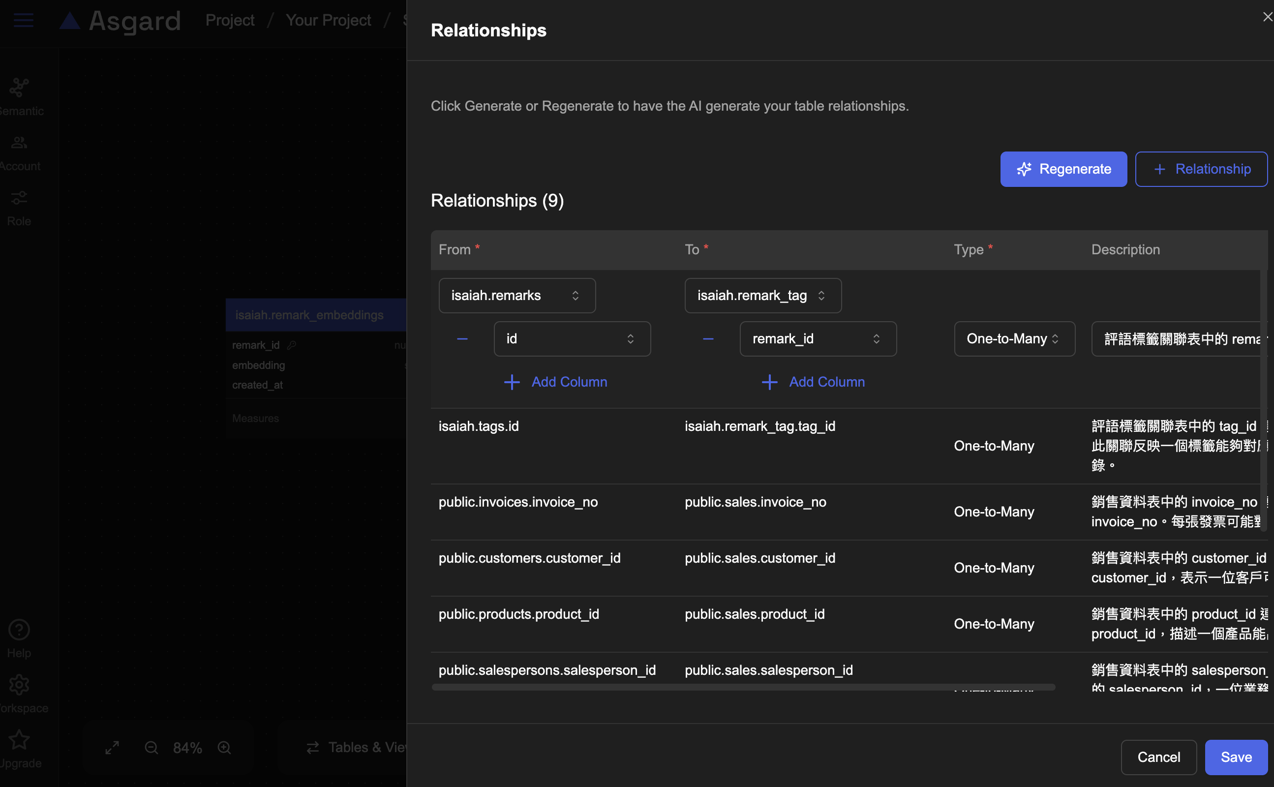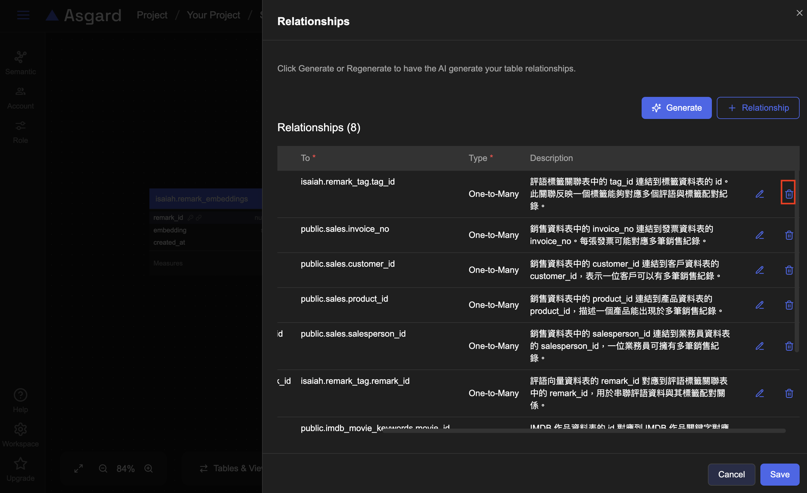 Relation 是資料表之間的關聯性 (例如訂單表與客戶表的連結),在 Semantic Layer 中設定 Relation,可以幫助 AI 理解不同資料表之間的邏輯關係,讓查詢與圖表生成更正確。