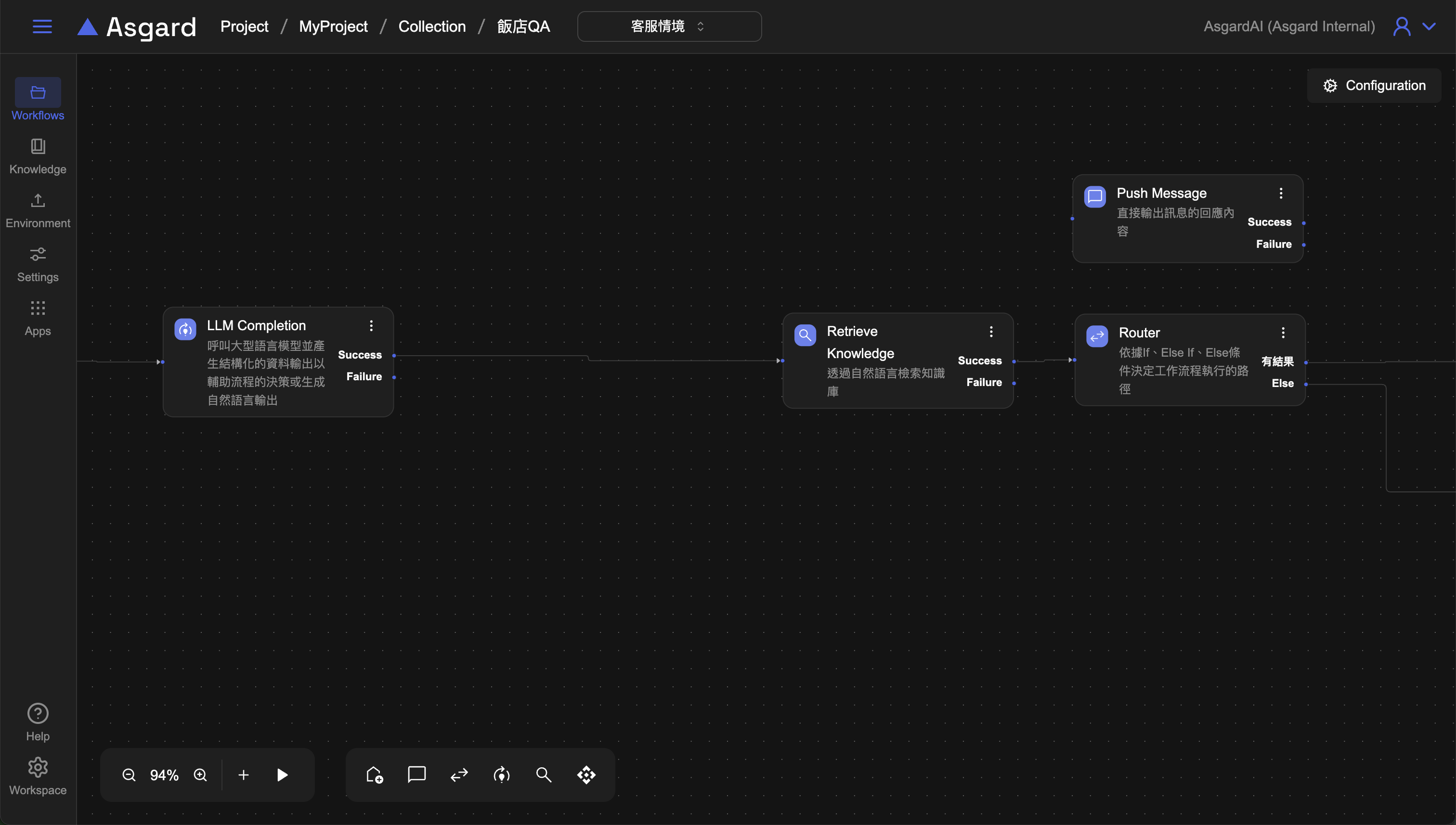 點擊上方「飯店QA」名稱返回Collection可以看到剛剛分別在飯店QA與客服情境裡新增的Exit與Entry,將 Exit 與 Entry 連接便完成了 AI 找不到回答的流程處理,並能將用戶導向到先前設計的 Listen Message 去聆聽用戶問題並判斷是否為客服情境。