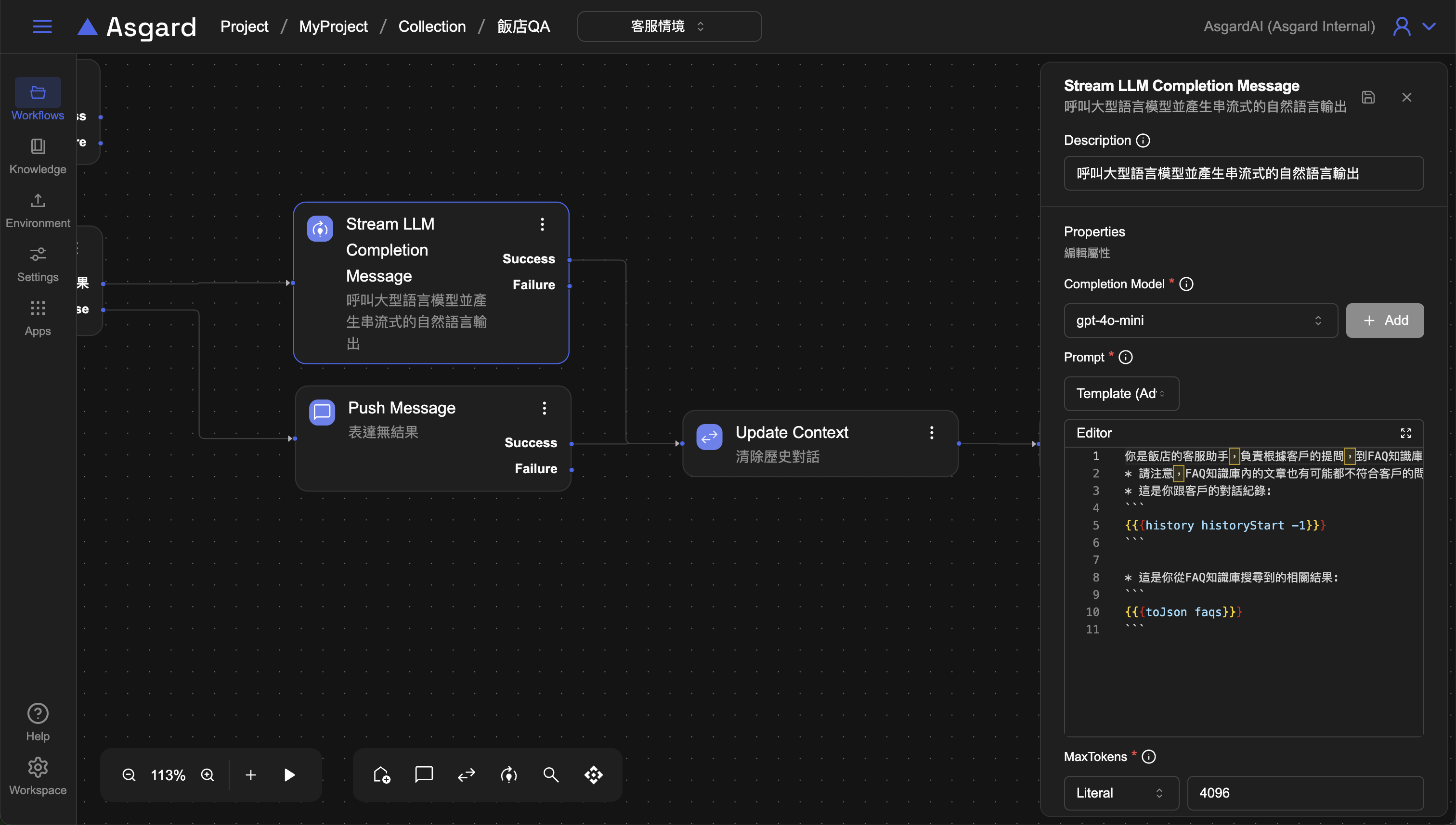 historySize為 Asgard 內建函數,historyStart 為先前在 Update Context 裡所新增的變數,historySize 是指訊息的總量,每一則訊息都會記算一筆,算到上一個對話為止,因此這裡是將 historyStart 更新為 historySize,讓 AI 從新一輪的對話開始。