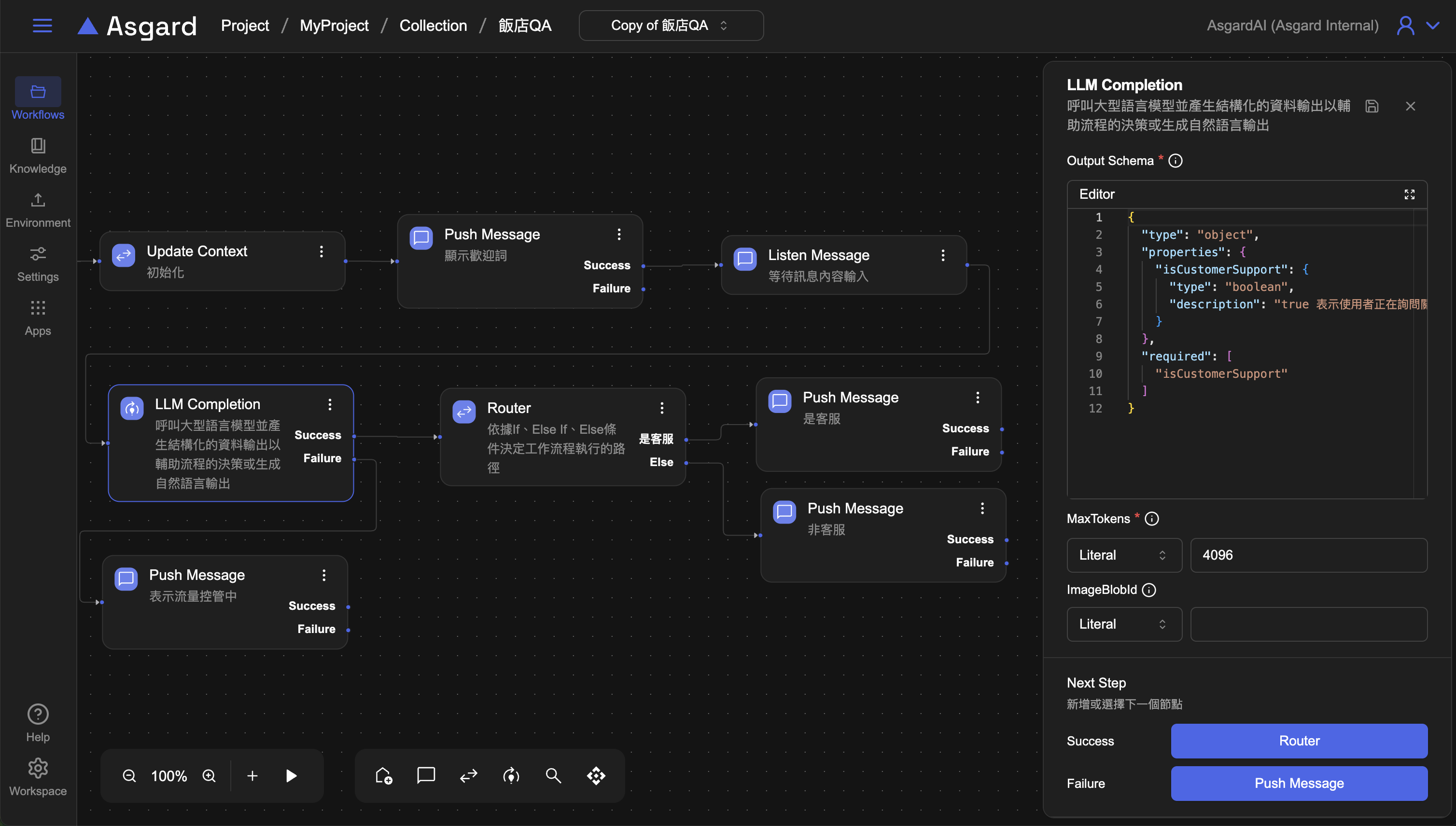 isCustomerSupport 是我們在 LLM Processor 設定時,請求 AI 協助判斷的一個 object,假如為 TRUE 代表 AI 判斷為客服情境,假如為 FALSE 則不是客服情境。