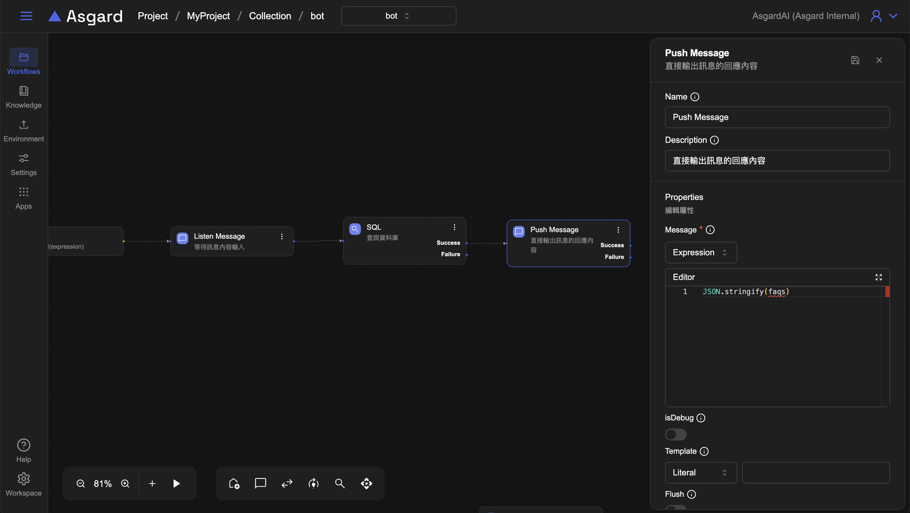 常見的AI應用通常都會與用戶互動去聆聽用戶的訊息或是輸入的資料來進一步操作,Asgard內建的函數可以幫助設計互動性高的工作流程。本章範例示範讓用戶輸入一個訊息並查詢資料庫後印出對應內容。