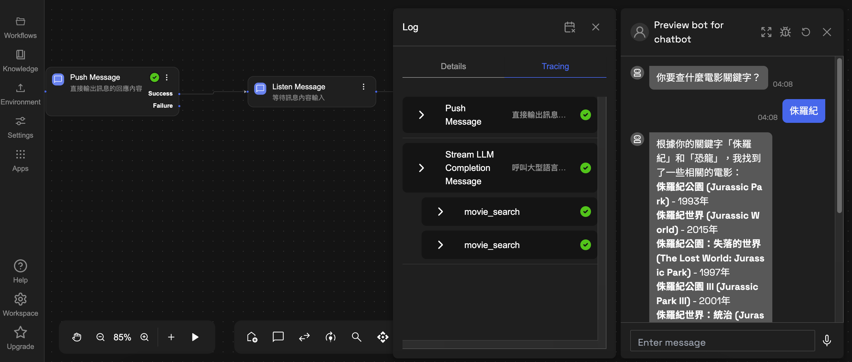 假設你在 Chat Bot 輸入「侏羅紀」,AI 會自動幫你把這個關鍵字延伸、拆解成「侏羅紀」、「恐龍」這類相關詞,因為我們在 Prompt 裡有要求「至少要用2個關鍵字以上做搜尋,不要只搜尋一次」。
