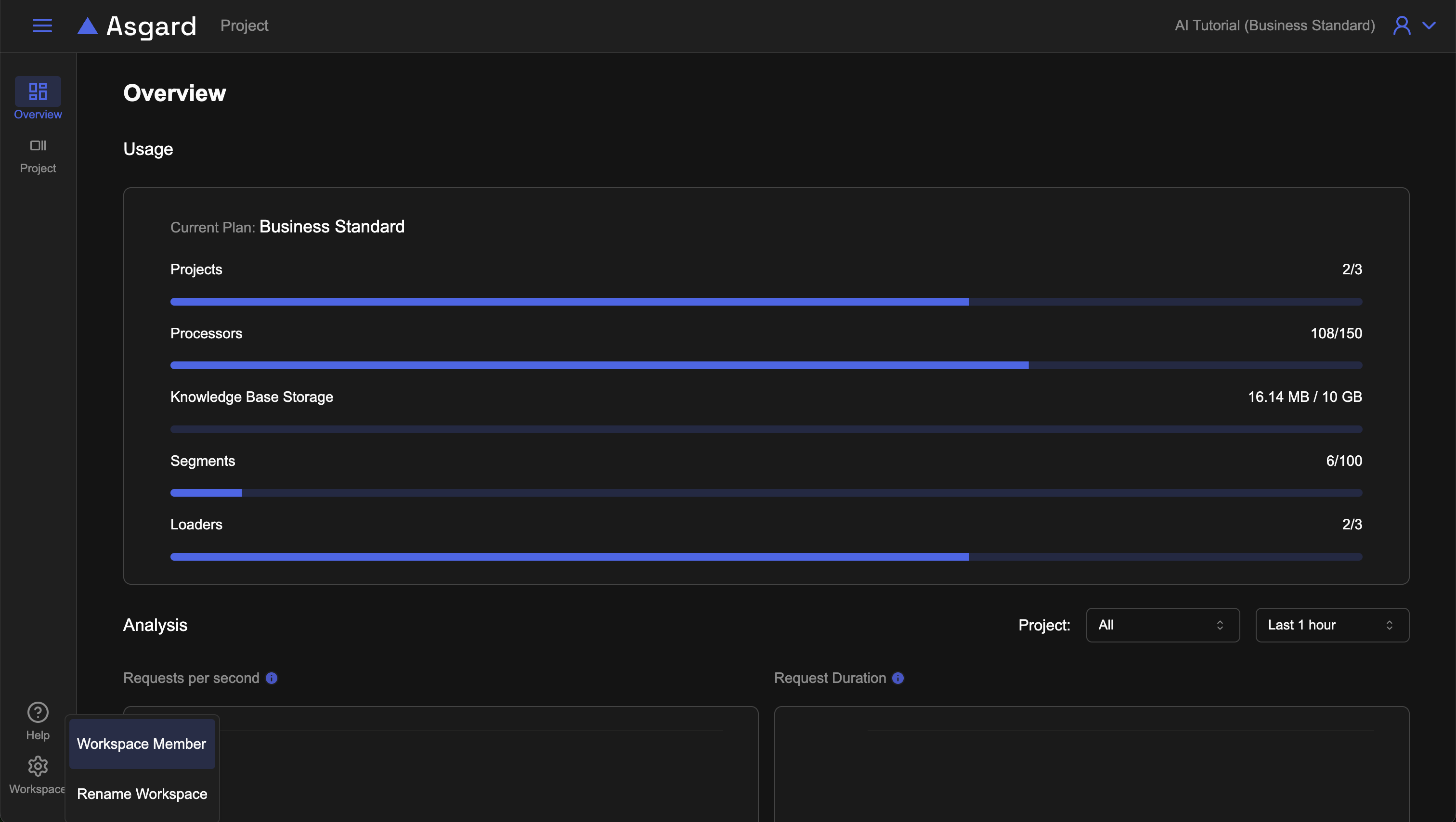成功加入Asgard AI並登入 Odin 後,預設會進入工作空間的概覽頁面,您可以在此頁面檢視目前工作空間的使用情況,包含專案(Project)、處理節點(Processors)、知識庫儲存空間(Knowledge Base Storage)、分段(Segments)、擷取知識載入(Loaders)等,依據您購買的方案會有不同的額度使用呈現。