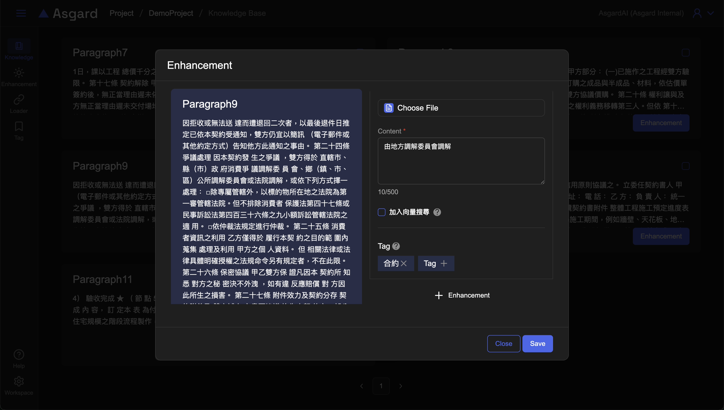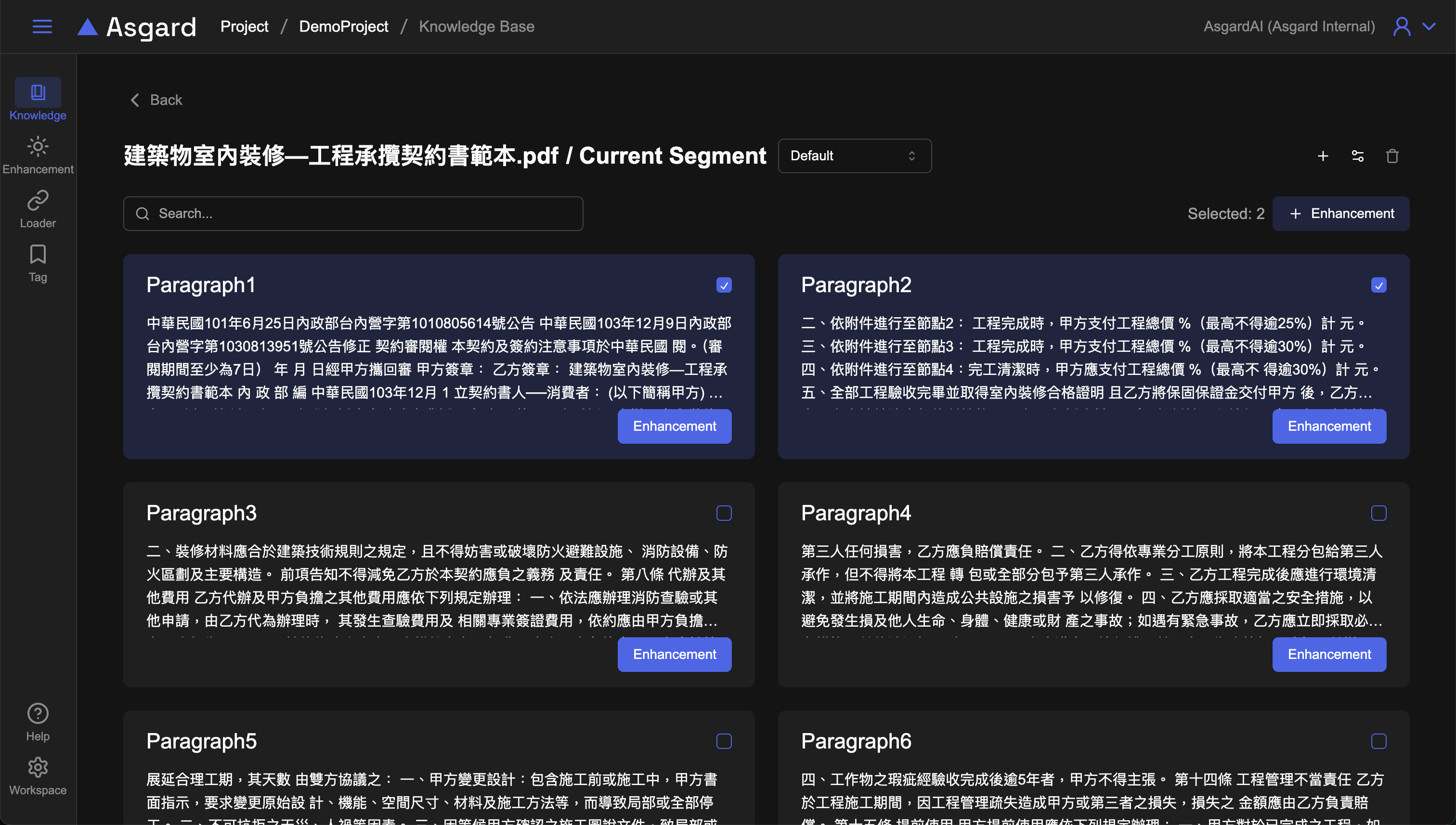 在基本的 RAG 功能之上,您可以隨心所欲地在檔案分段裡添加增強(Enhancement)以促進 AI 理解的程度。您可以在檢視檔案分段時新增 Enhancement 或是統一在 Enhancement 管理頁面新增。