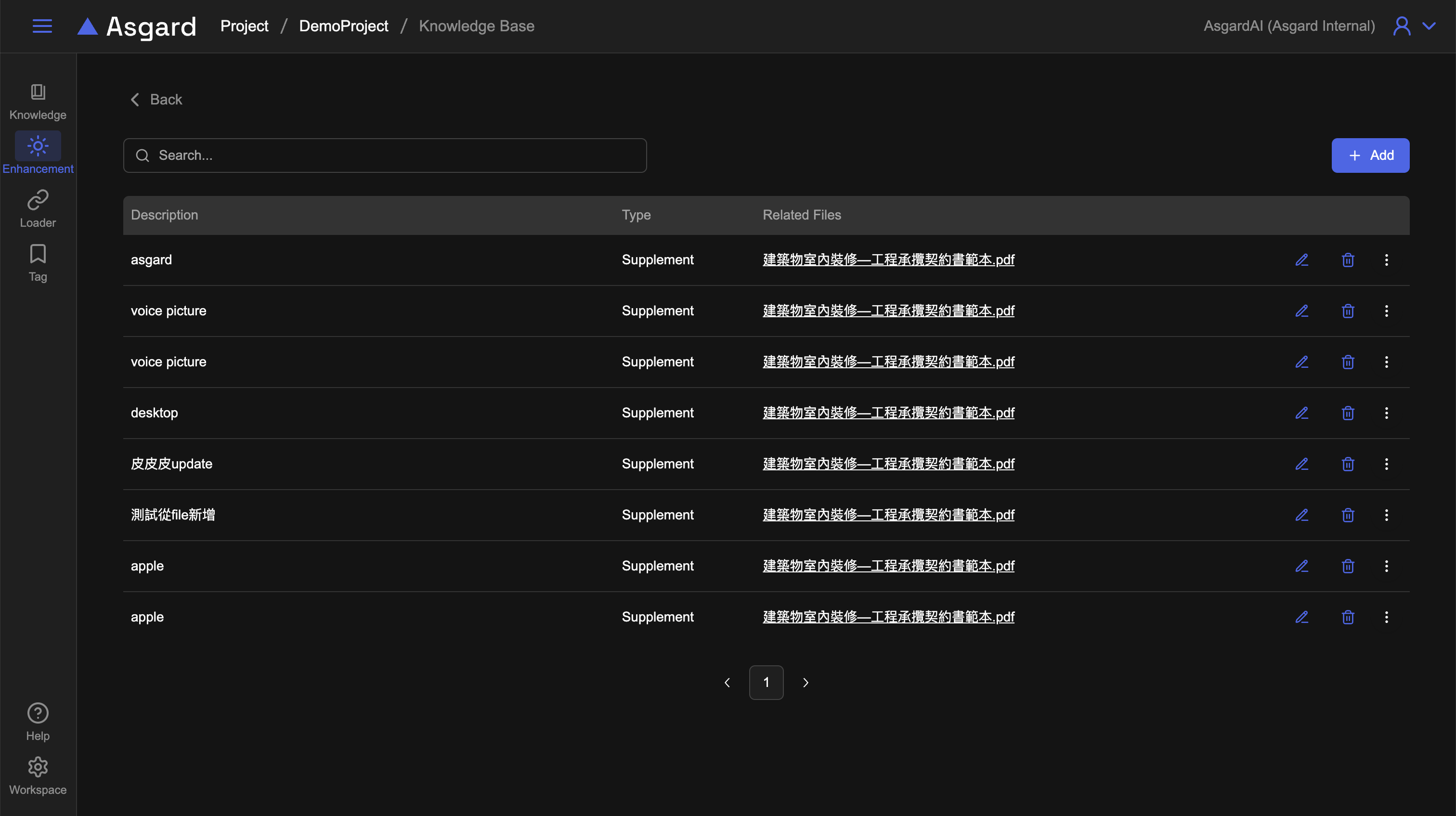 點擊右上角的「+ Add」進入新增 Enhancement 設定,此處設定與由檔案內新增相同,有三種增強類型可以選擇:補充內容(Supplement)、問題(Question)、答案(Answer)。在填寫增強時,可以上傳檔案作為補充資料(選填);可以勾選是否要將該增強加入向量搜尋。