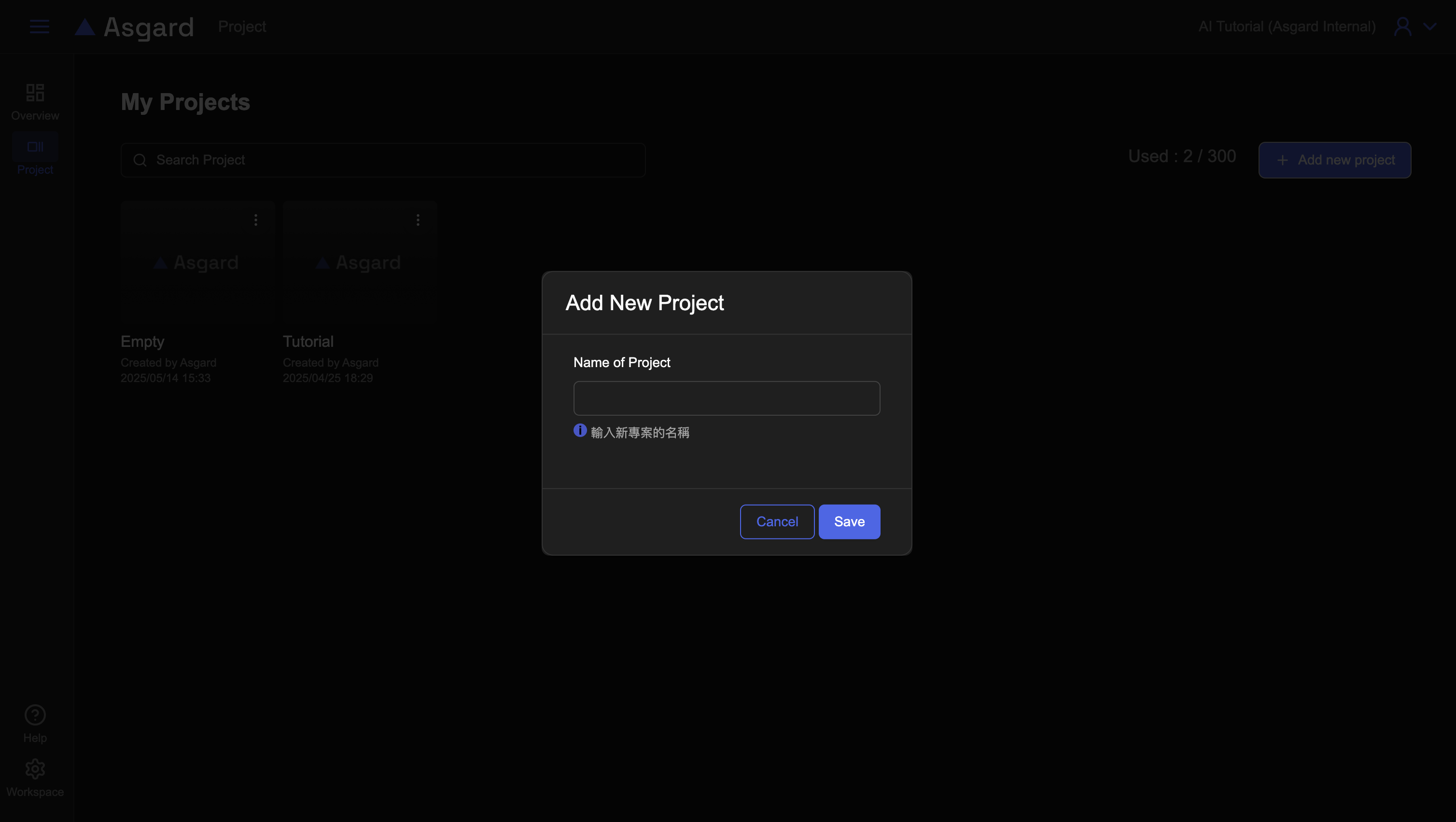 進入 Workspace 後,可以點擊中間的新增專案或是在右上方側功能列點擊「+ Add new project」以新增專案。