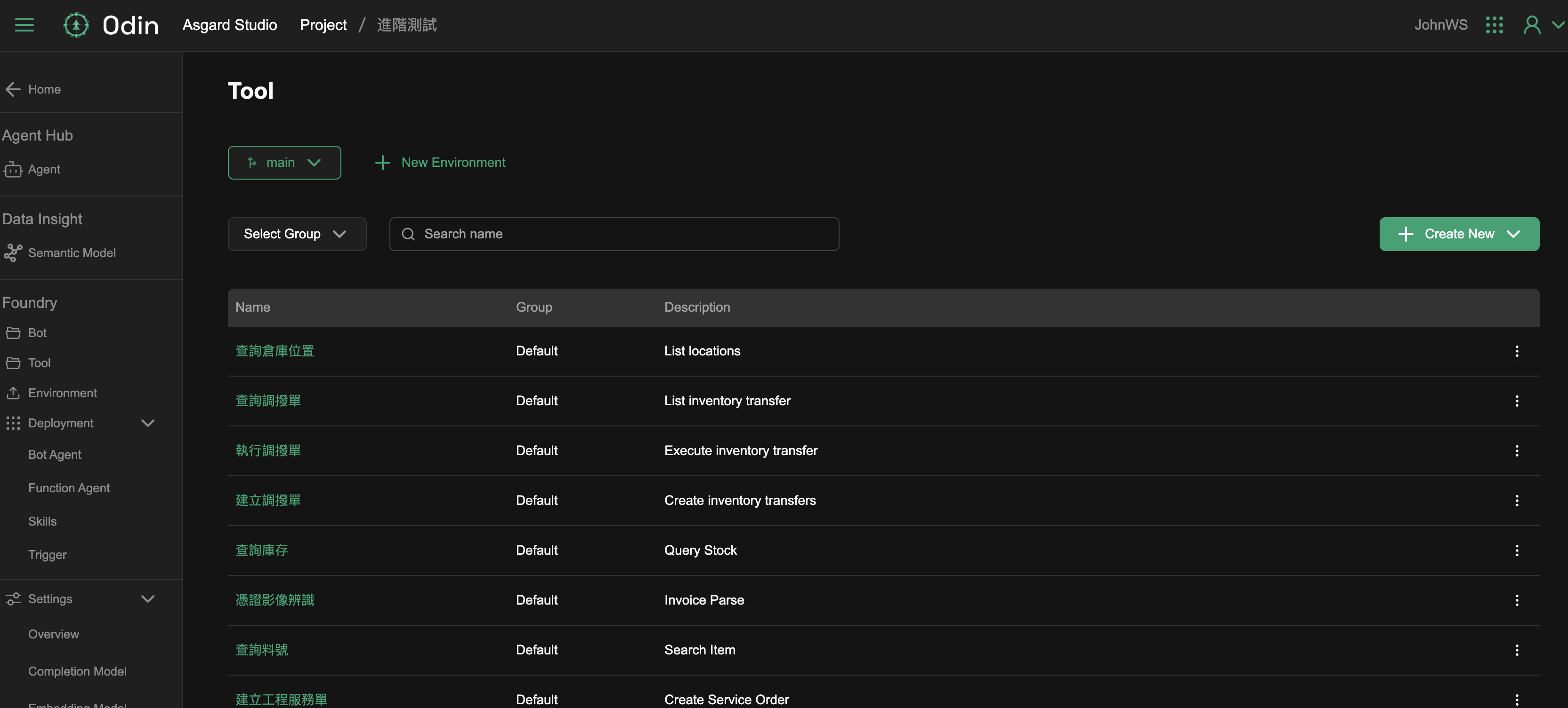 建立好 Project 之後,系統預設會幫您建立主要工作環境(Main),在主要工作環境可以繼續新增類型為 Bot 或是 Automation Tool 的 Foundry,Foundry 是一群 workflow 的集合,在 Foundry 裡會有主要且唯一的 workflow 起點,也就是工作流程的進入點。