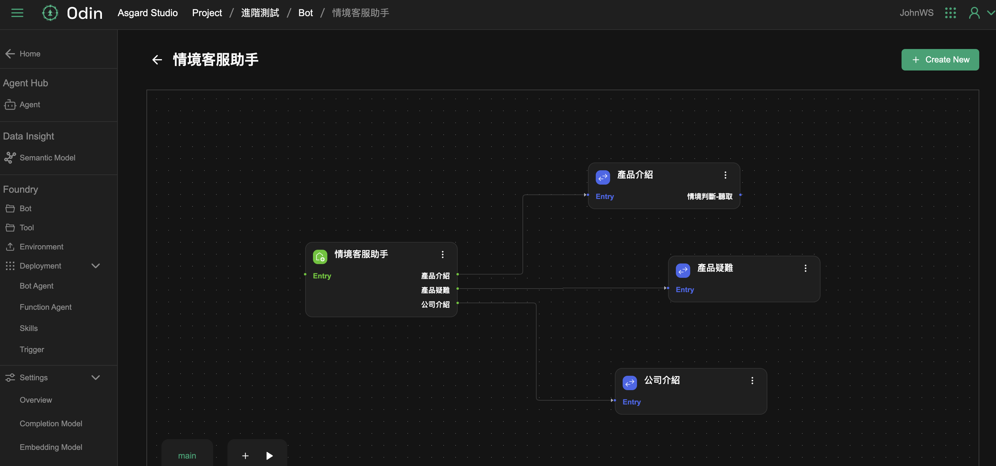 點擊建立好的 Bot 類型 Foundry 進入 workflow 的新增功能,系統已自動建立好 Main 的環境以及一個 Workflow 的起點,注意一個 workflow 集合只會有唯一的起點,若需要變更起點,您可以使用變更 workflow 起點功能去變更。在 Bot 類型裡,您可以自由新增多個 workflow 不受限制。